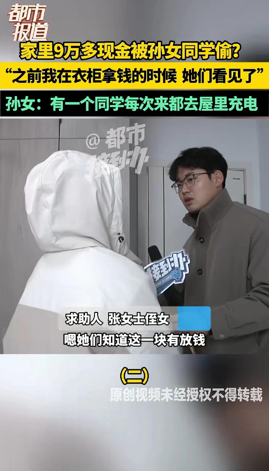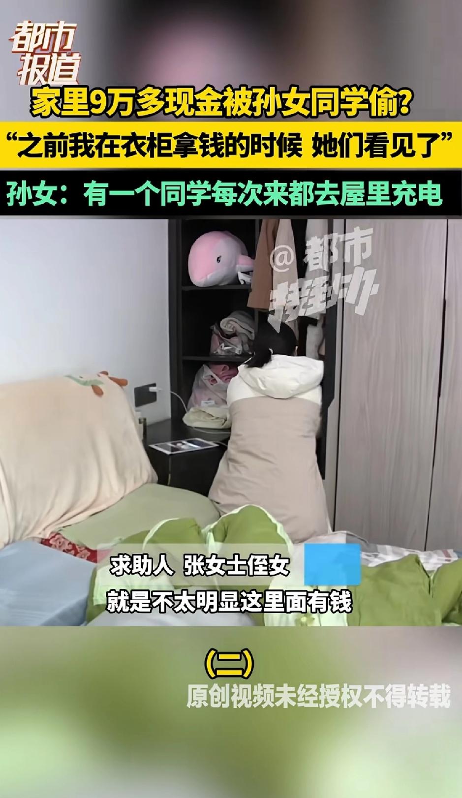 家里9万多现金被孙女同学偷? 孙女:之前有一个同学每次来都去屋里充电,之前家长从柜子里拿钱被孙女同学看见了! 求助人张女士也报警了,跟对方家长电话沟通,对方只承认拿了几千块钱。还有另一个女同学一起跟着来家里玩,现在丢失的这9万块钱也对不上数,又是一笔糊涂账。一切还要听警方通报。 家里人太粗心大意了,放了几万块现金,家里来陌生人,应该注意点。 钱被陆陆续续拿走,最后才发现,这事都不好说清楚。尤其是未成年人作案,不过涉案金额足够立案调查了,现在只是取证困难。又不是一个人作案,也不是一次作案,估计警察也不好取证。 希望这件事最后能够真相大白,给失主一个交代。