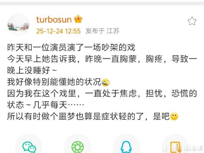孙俪因入戏太深状态焦虑孙俪因角色压力太大 看到对手演员因吵架戏胸蒙胸疼失眠,瞬间共情,因为自己在戏中也几乎每天被焦虑、担忧的情绪笼罩,好演员的投入太让人心疼~孙俪因拍戏每天焦虑