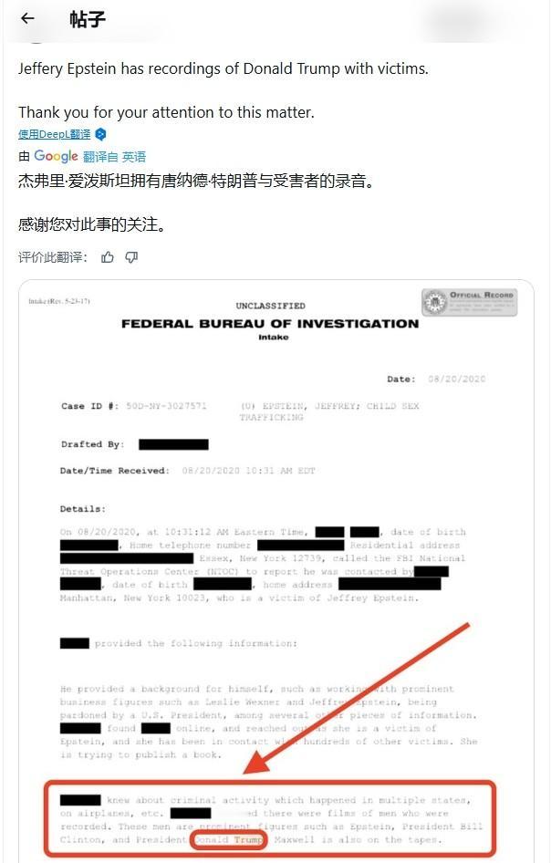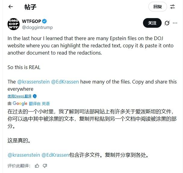 涂了个寂寞!爱泼斯坦文件被“破解”,“特朗普”出现600多次 美国司法部对爱泼斯坦案文件的涂抹,涂了一个寂寞。 12月23日,有网友发现,虽然美国司法部发布的爱泼斯坦案文件被大面积涂抹,但其中一部分内容可以通过复制到空白文档上显示出来。特朗普被曝8次乘爱泼斯坦私人飞机 换句话说,美国司法部对文件的所谓“处理”,仅仅是在原文本上增加了一个黑色涂层遮挡,底层的原始文字并未被删除。 由于司法部发布的文件数量过多,各路媒体和网友仍在对被涂抹的部分进行测试,但目前已经有部分内容被“解密”,其中一段的描述是: “在2015年9月至2019年6月间,爱泼斯坦遗产的执行人达伦·因迪克签署了一笔超过40万美元的协议,用于支付给年轻女模特和女演员,其中包括一名俄罗斯模特,她在三年半的时间里,每月能收到8333美元,总共收到了超过38万美元”。MCN双量进阶计划 另外,还有网友发现,在美国司法部发布的某份文件中,“特朗普”的名字以涂黑的形式出现了600多次。