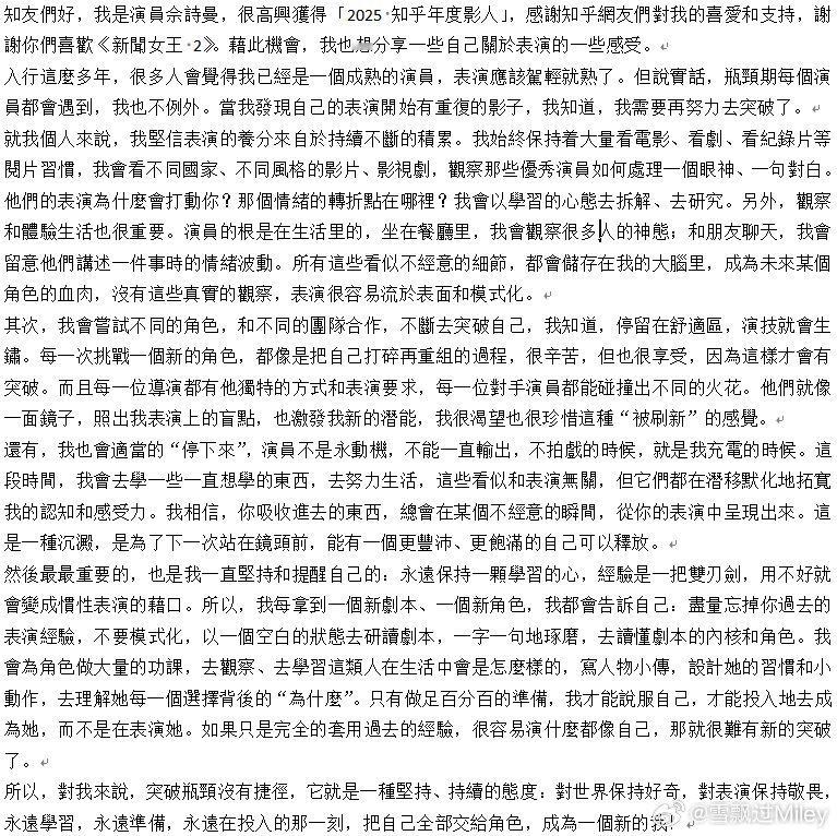 成熟演员在遭遇表演瓶颈时,通常会如何突破?佘诗曼在知乎上回答的问题转载。“突破瓶頸沒有捷徑,它就是一種堅持、持續的態度:對世界保持好奇,對表演保持敬畏,永遠學習,永遠準備,永遠在投入的那一刻,把自己全部交給角色,成為一個新的我!”佘诗曼新闻女王2 佘诗曼