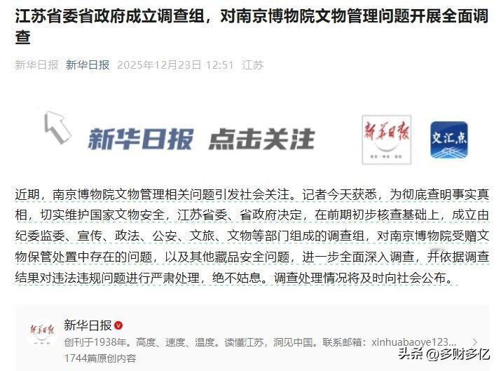 炸穿热搜!南京博物院42人实名举报,退休老人硬刚,官方动真格了! 闹大!南京博物院事件升级:退休员工联合42人实名举报,官方介入 近日,南京博物院火上了热搜,但原因却让人意想不到。 起初是因为一副名家大作《江南春》。 然而,随着事情在网上的不断发酵,大家才发现原来《江南春》只是导火索,其背后隐藏的大瓜,才是更加炸裂的,足以颠覆人的三观和认知。 你敢信吗?42个人啊!清一色的南京博物院退休老员工,有的是干了三四十年的文物征集研究员,有的是守了一辈子库房的管理员,最年长的都快80岁了,一辈子没跟人红过脸,现在居然联名按下红手印,实名举报自己待了大半辈子的“家”! 这《江南春》到底藏着啥猫腻?有知情人透漏,这幅号称“名家大作”的藏品,当初征集的时候就疑点重重——既没有公开的征集公告,也没有第三方专家的权威鉴定报告,甚至连征集价格都含糊其辞。更让人费解的是,这么一幅争议作品,居然能跳过常规流程,直接进入馆藏精品序列,还多次拿去外地参展,这操作谁看了不迷糊? 可这还只是冰山一角!这些退休老人手里攥着的证据,远比一幅画的问题更严重。有老研究员说,近几年院里的文物征集越来越“随心所欲”,一些明显不符合馆藏标准的东西,靠着某些人的“打招呼”就能顺利入库,而真正有价值的民间藏品,反而因为“流程复杂”被拒之门外。更让人揪心的是,部分文物的修复和保护也存在漏洞,有的珍贵字画修复时居然用了不符合规范的材料,这哪是保护文物,简直是在毁宝贝! 为啥这些老人非要一把年纪了冒这么大风险?说白了,他们是把文物当孩子疼啊!有位退休的库房管理员接受采访时红了眼:“我守了30年库房,每一件文物的纹路、每一处破损都记在心里,那是老祖宗留下来的根,不是某些人谋私利的工具!” 这话听得人心里发酸——他们退休后本可以含饴弄孙、安享晚年,却偏偏选择站出来,不是为了自己,而是怕这些承载着历史记忆的宝贝,在乱象中遭了殃。 更关键的是,实名举报可不是闹着玩的!在文博行业,这些老人都是有头有脸的前辈,一辈子爱惜羽毛,要是没有实打实的证据,谁愿意赌上自己一辈子的名声?而且42人联名,意味着这不是个人恩怨,而是对行业乱象的集体反抗,背后肯定藏着更多没被曝光的隐情。 现在江苏省文旅厅已经明确表态,会成立专项调查组介入调查,这事儿总算是有了实质性进展。但网友们的疑问还没解开:举报的问题到底涉及多少人?有没有造成文物损坏或流失?后续会不会有人被追责? 说真的,南京博物院作为全国顶级的博物馆,承载的不光是文物,更是无数人的文化信仰。大家愿意相信这里是文物的“避风港”,是历史的“传声筒”,可这次的举报事件,却让这份信任打了折扣。这些退休老人的硬刚,其实是在给整个文博行业敲警钟——文物保护容不得半点私心,行业规范不能成为一纸空文。 目前调查还在进行中,后续结果咱们还得等官方通报。但不管怎么说,这些老人的勇气值得所有人点赞,他们用行动告诉我们,总有人在为守护历史拼尽全力。 各位读者你们怎么看?欢迎在评论区讨论。