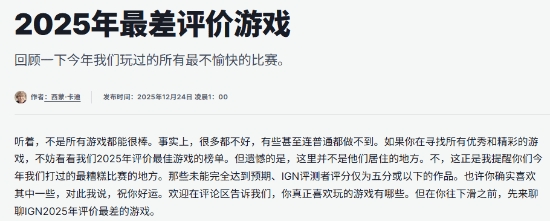 直播吧12月24日讯 IGN今日发文,回顾2025年最垃圾的几款游戏。该榜单上的游戏在IGN的评测中均不高于5分,不过值得庆幸的是,今年没有低于4分的游戏。