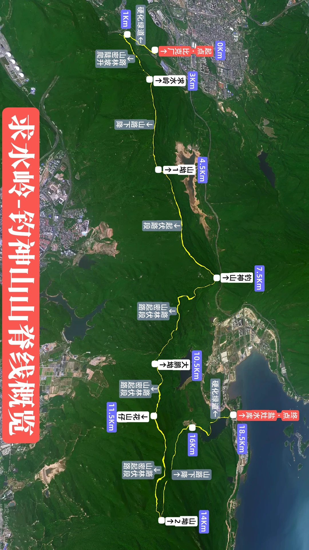 这是一条比较小众的山脊穿越路线,起点可设在比克厂或迭福山绿道,途经求水岭、钓神山、大鹏坳、花山仔,山脊线视野开阔,风景秀丽,可俯瞰大鹏湾、大亚湾海景,可远眺梧桐山、梅沙尖、七娘山、大笔架山、排牙山等深圳一众著名山峰,是一条人少景好,且被低估的徒步路线。