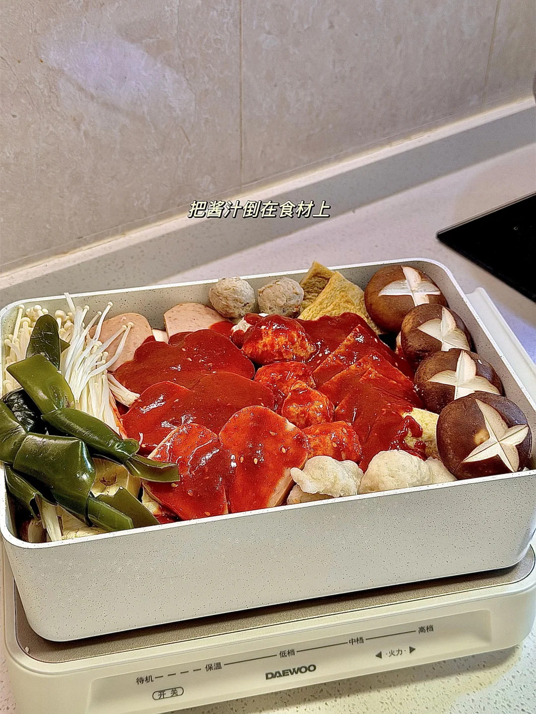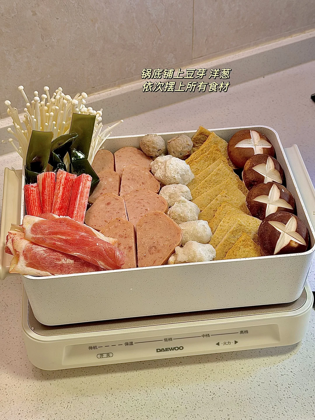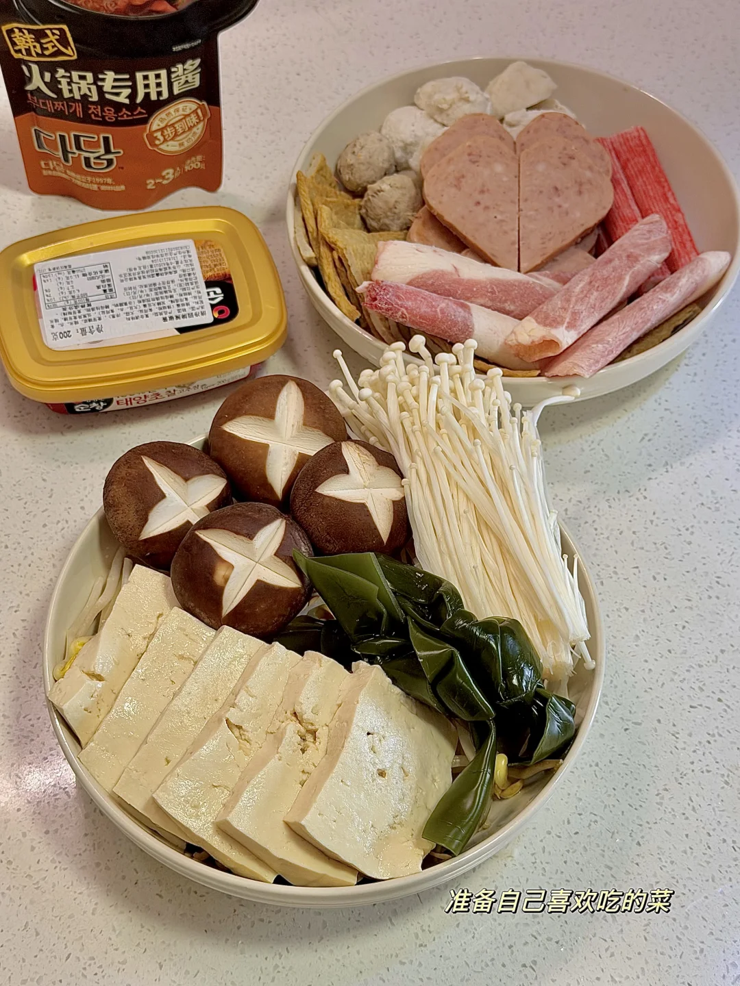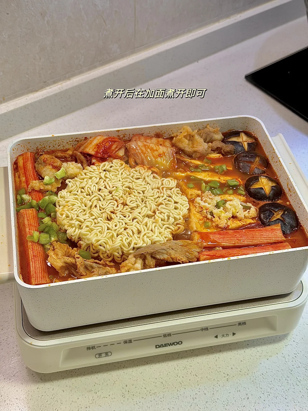 家庭版贼简单的暖乎乎的韩式部队火锅 下班后约上两三好友,聊着八卦吃着火锅😋 . 准备食材:香菇 金针菇 豆芽 豆腐 海带 午餐肉 牛肉卷 蟹棒 墨鱼丸 鱼饼 泡面 韩式辣酱 喜欢吃什么就放什么 . 做法贼简单,就调个酱汁或者用专用的部队火锅料,煮开就可以了😋