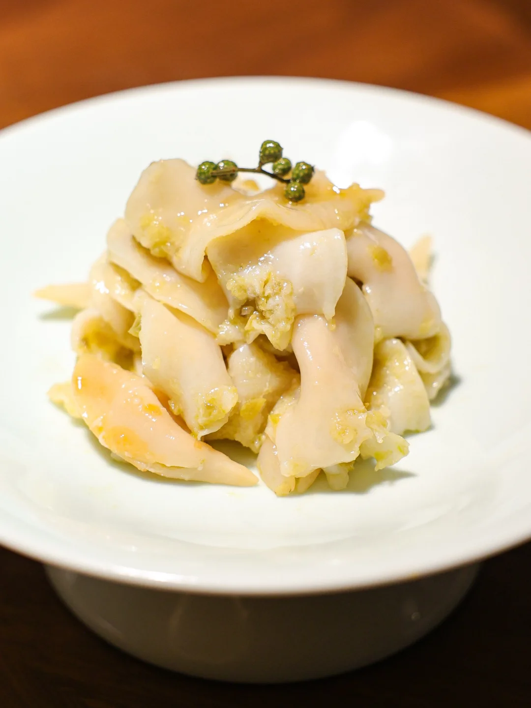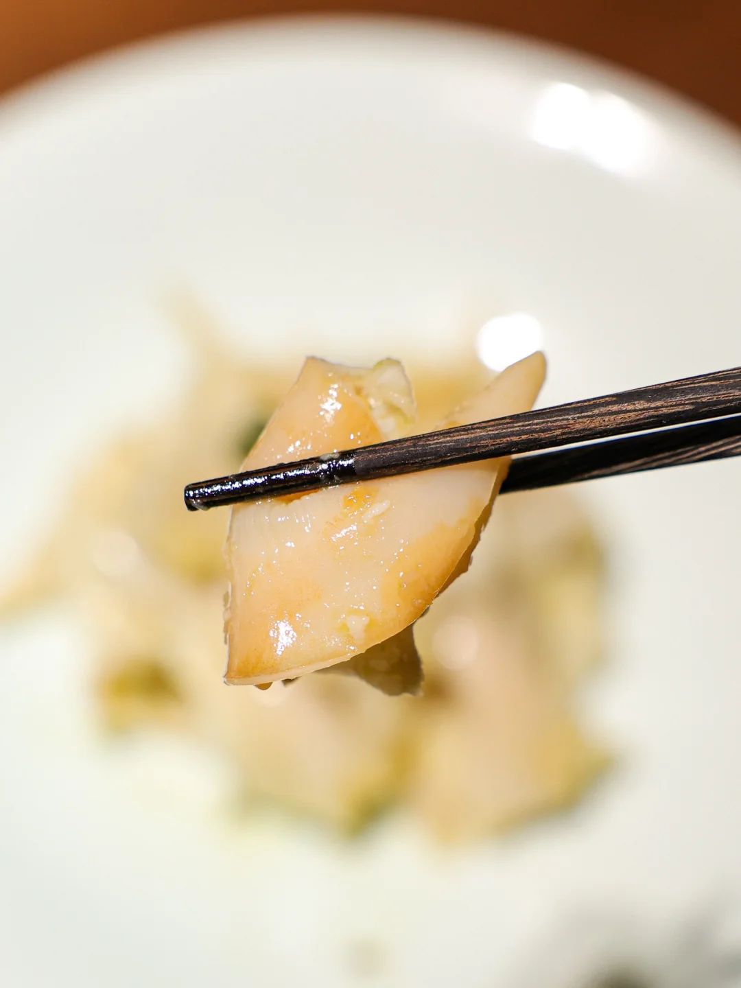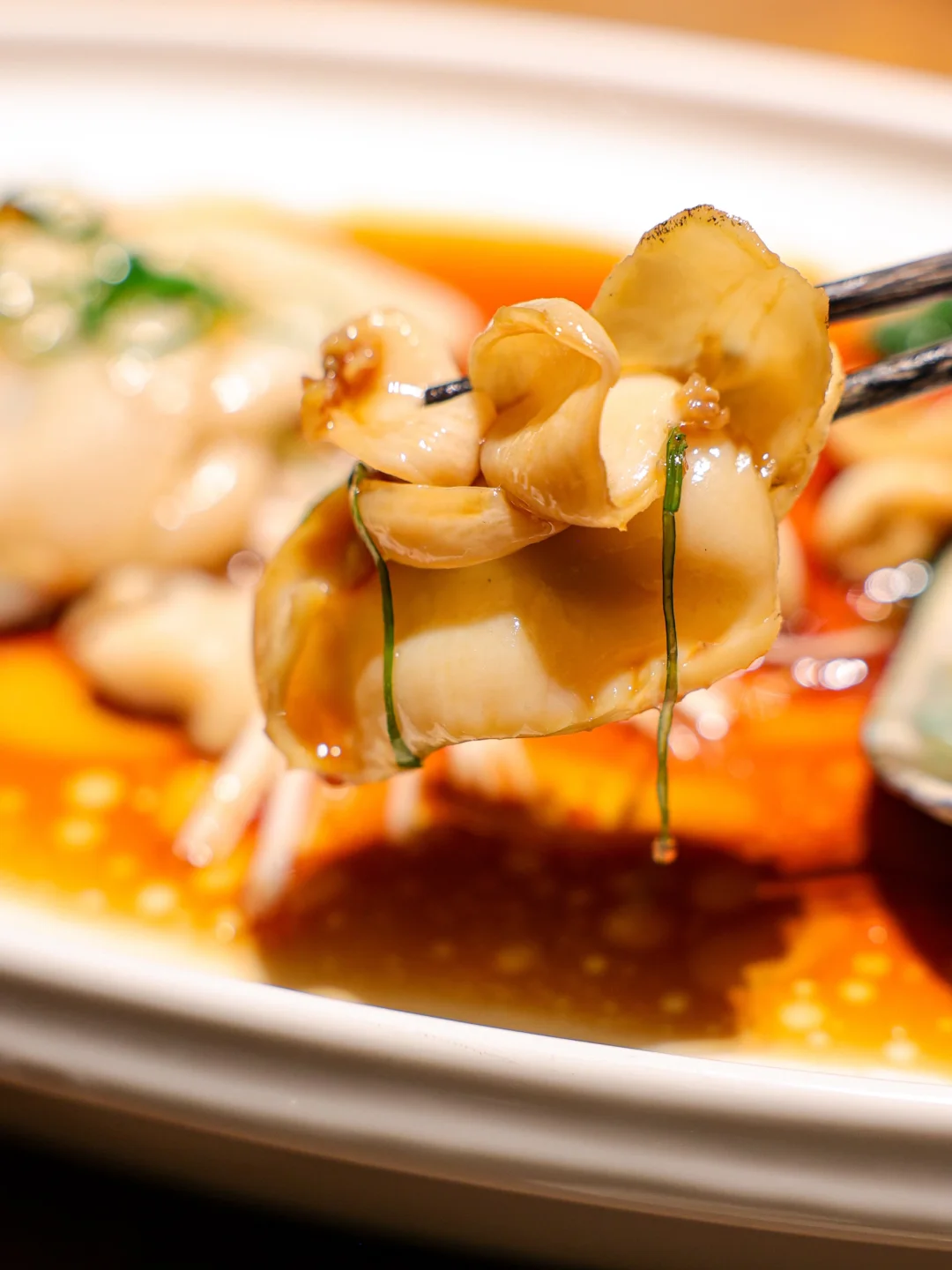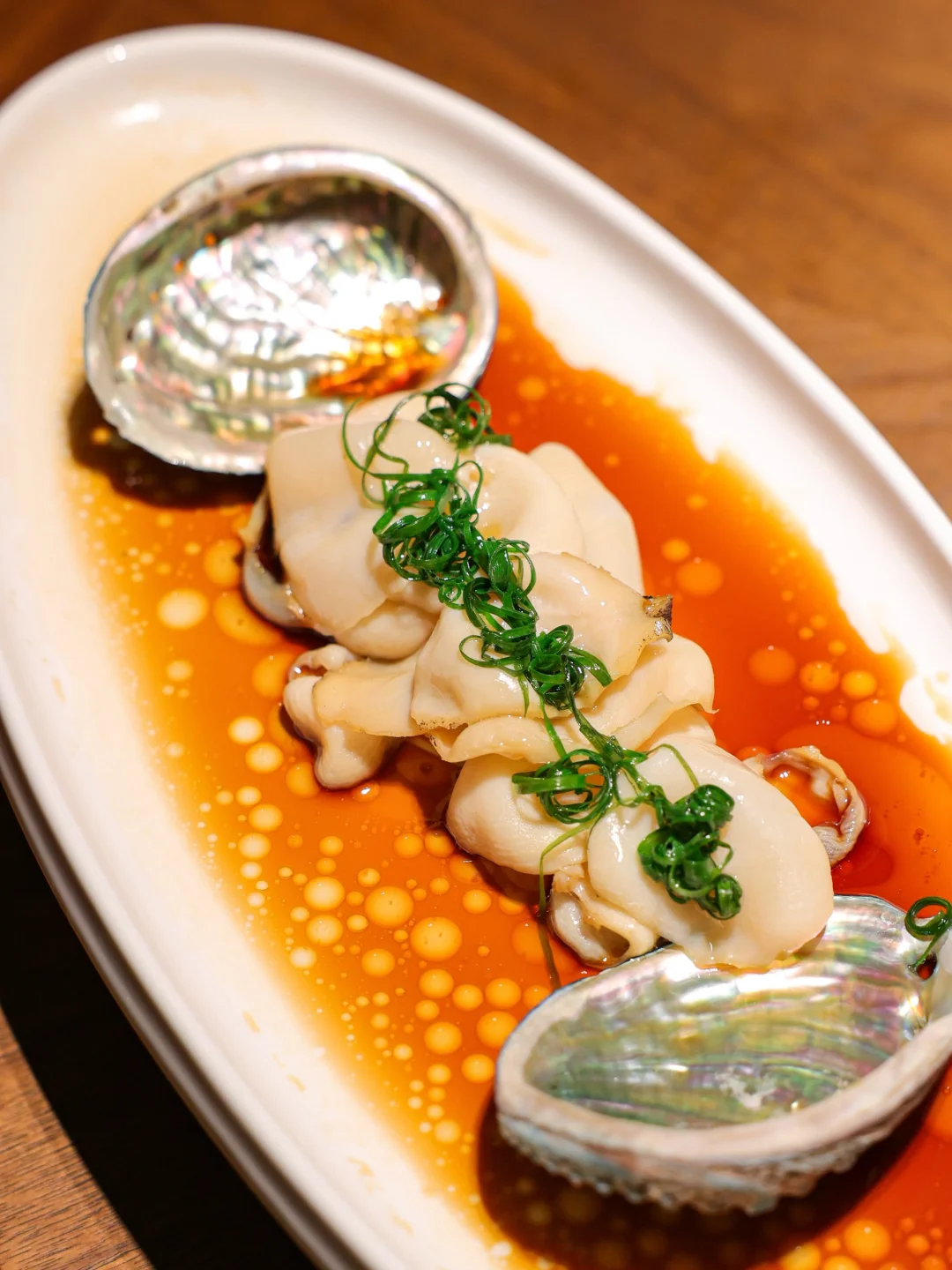 鲍鱼蒸熟之后是薄切的处理,淋上的葱油混合了章丘大葱、小葱和干葱。葱油特别香,但是和那种蒸鱼之后淋上的又略微有一些区别:因为混合了好几种葱,闻起来不会有太刺鼻的小葱味。