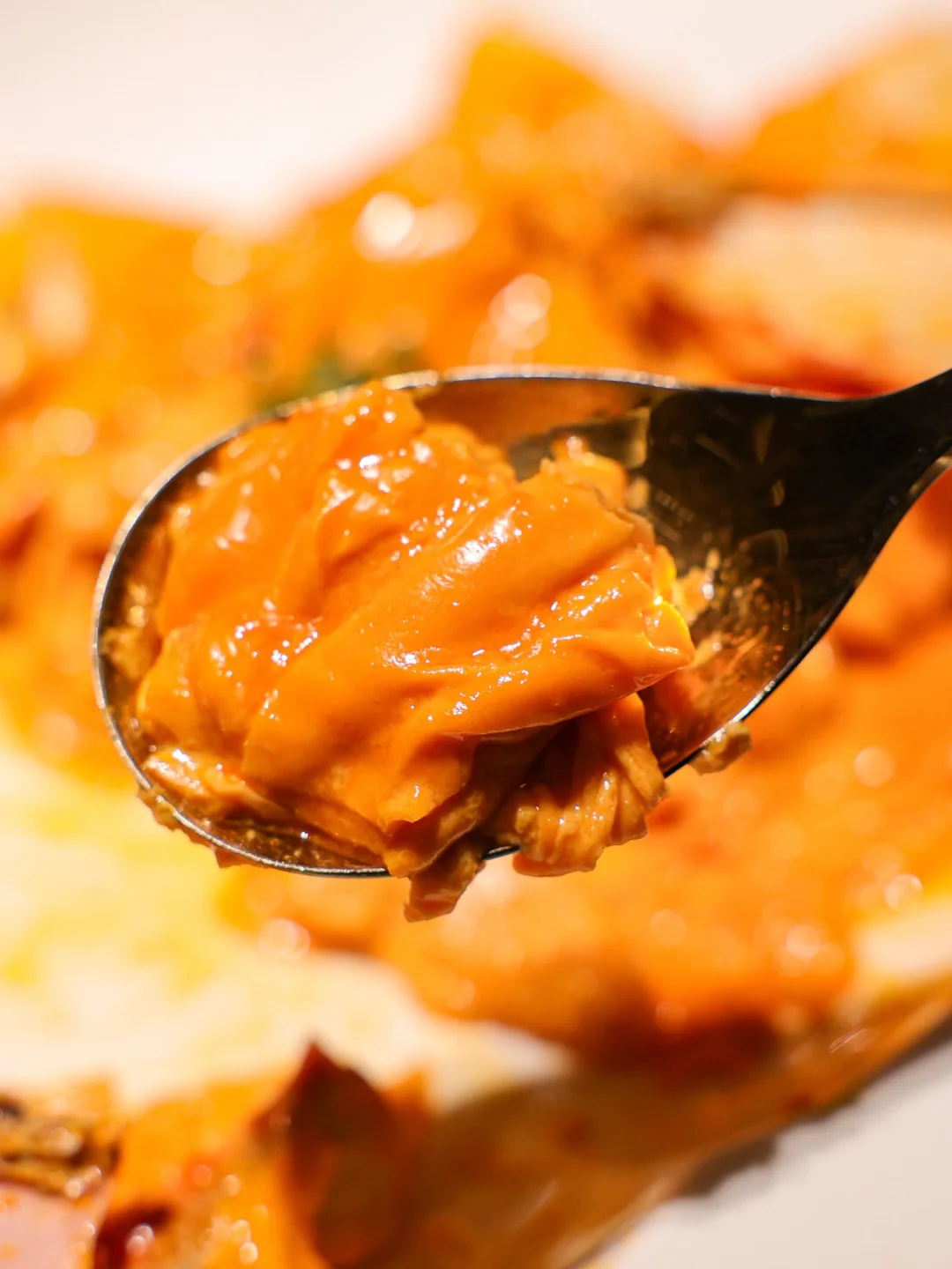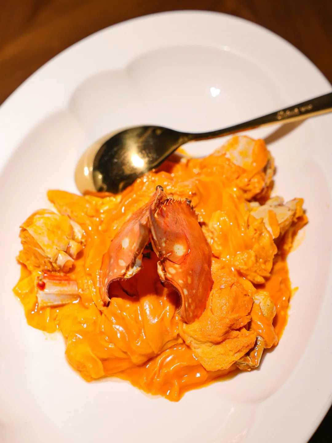 这道菜是先用老汤混合辣椒油收汁,将梭子蟹的鲜味煮出来之后再倒入混合了牛奶的蛋液炒制而成;鸡蛋非常嫩滑,我吃到结束都没有觉得会因为放久而变干硬;炒鸡蛋的色泽是如蟹壳一般的橘色,吃起来不会是辣油的刺激,我倒觉得有一股淡淡的卤水香味,越吃越想吃。
