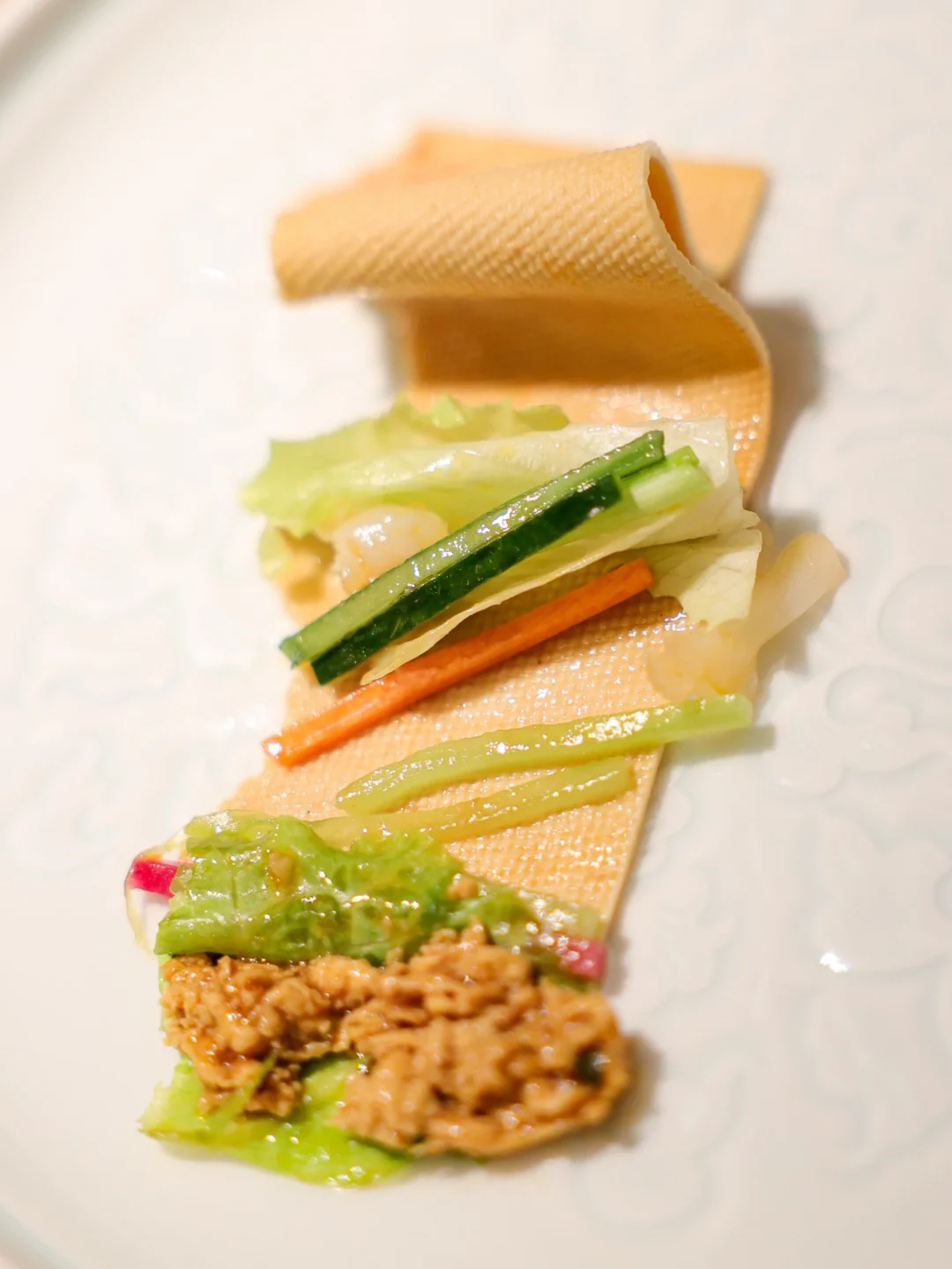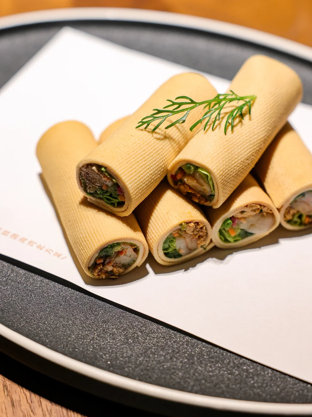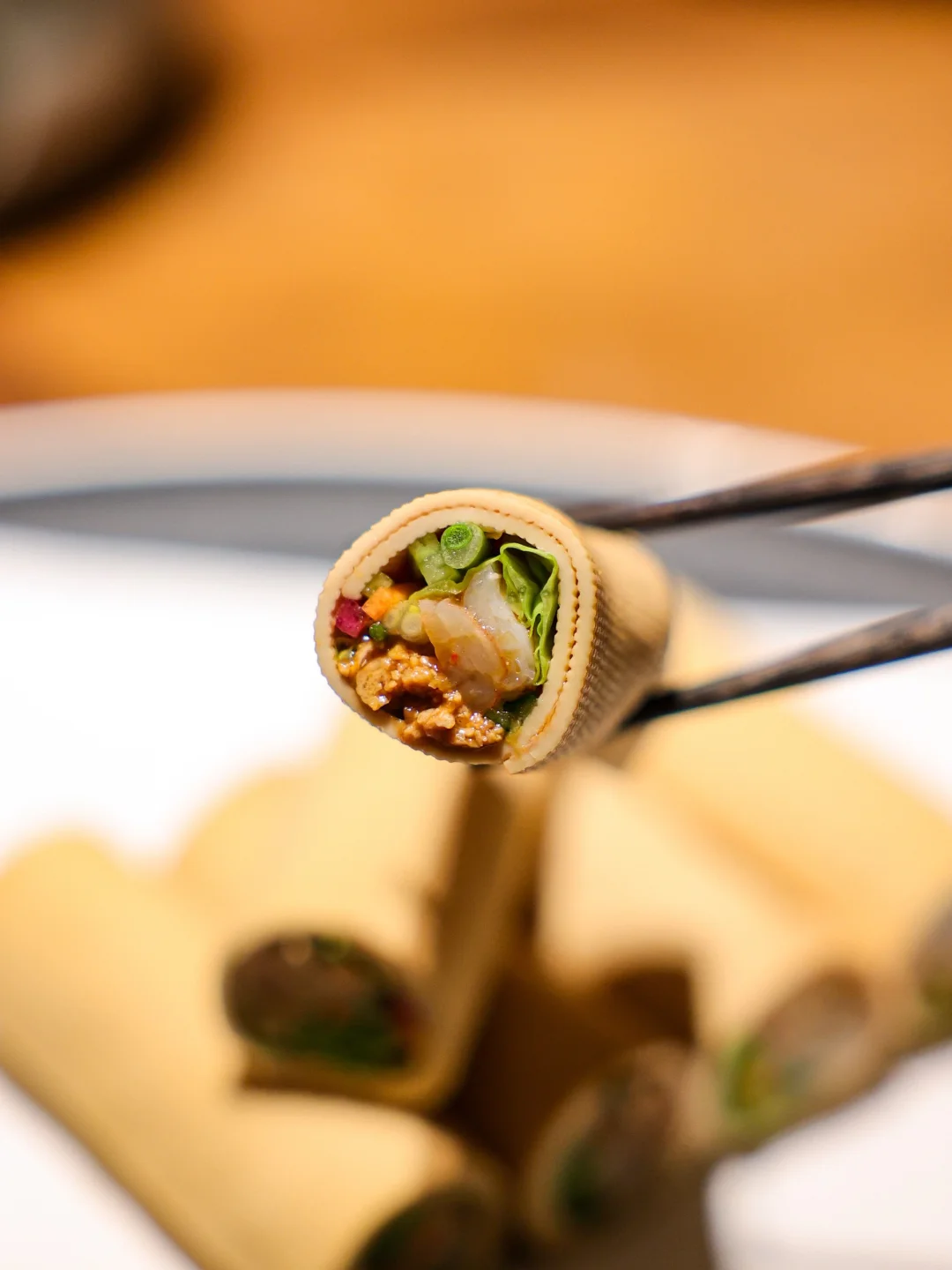 餐厅直接用干豆腐皮包好了的这种就有点类似taco的感觉,一口咬开,颇有韧劲的豆腐皮里包着切好了的各种脆口的蔬菜,咀嚼咬出汁水的空隙,则被鸡蛋酱的酱香咸鲜填满,本南方人初次体验,真的好满足!