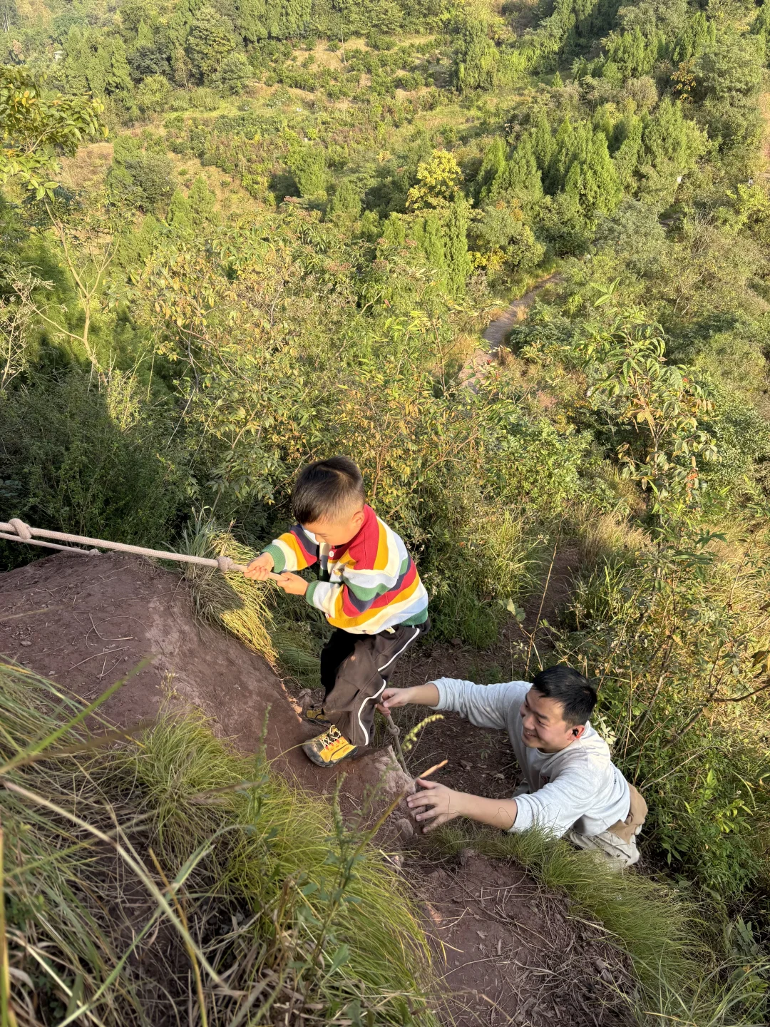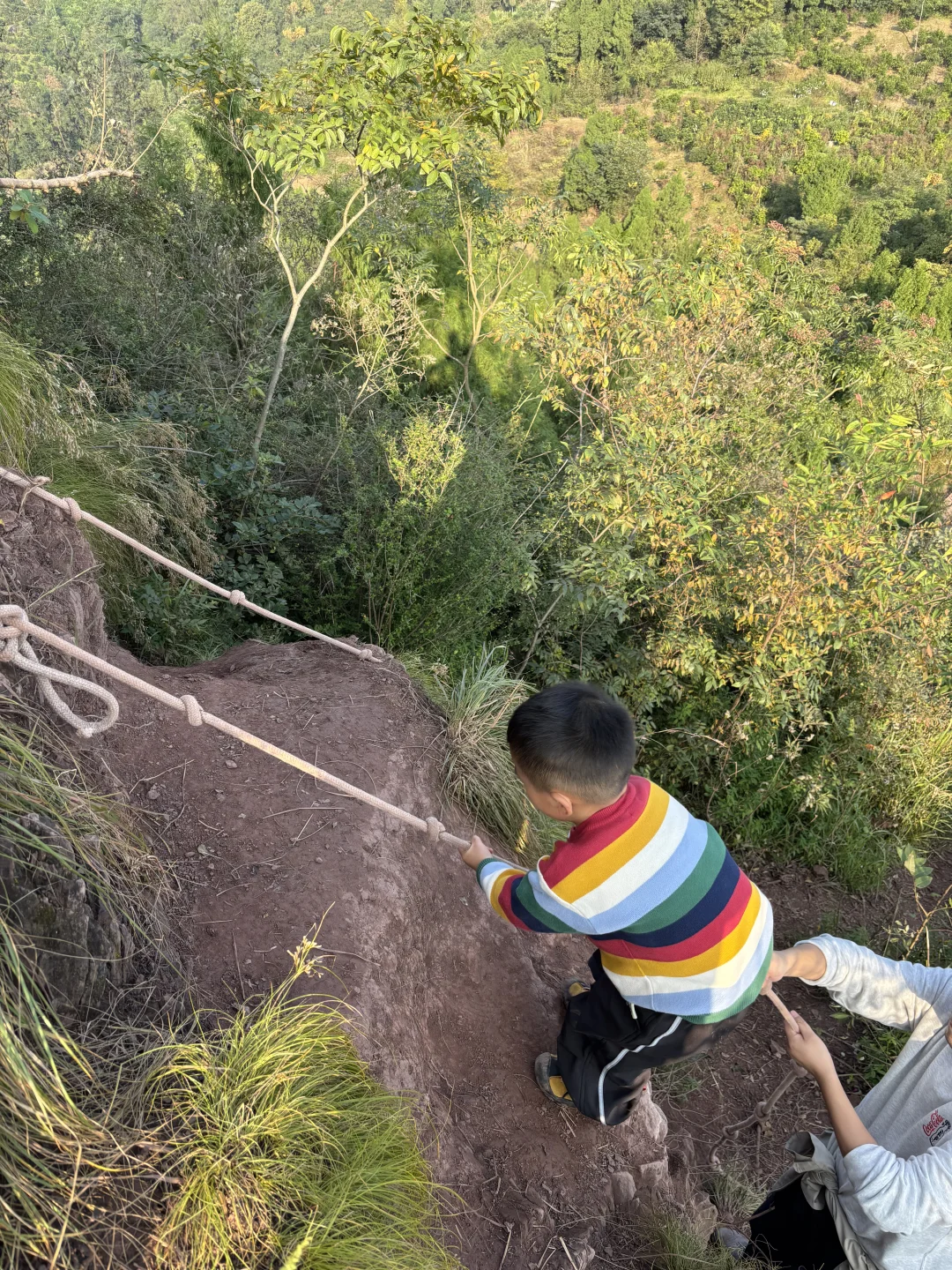 2,野路线:另外一条野路子,足够野!!沿着步道走的中途,遇到一个泥土路岔路口(见倒数第三张图),一路向上,穿越森林与荆棘,直达山顶,到达山顶后,走左边的小路,然后沿路下坡,遇到绳索下坡,则可回到主干道。这条路线5岁以上的孩子可以冲!!