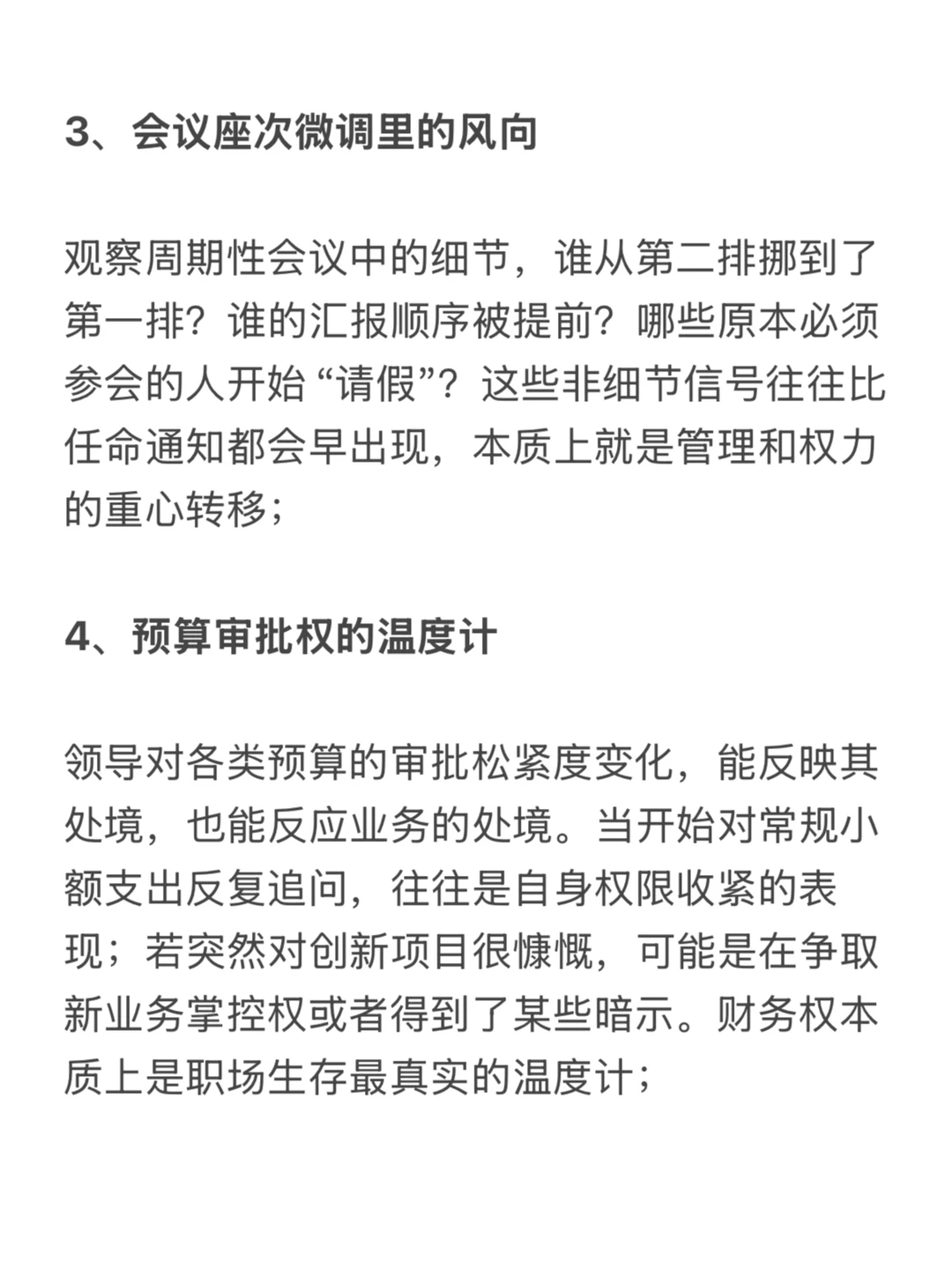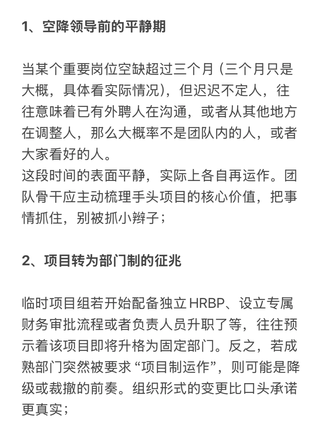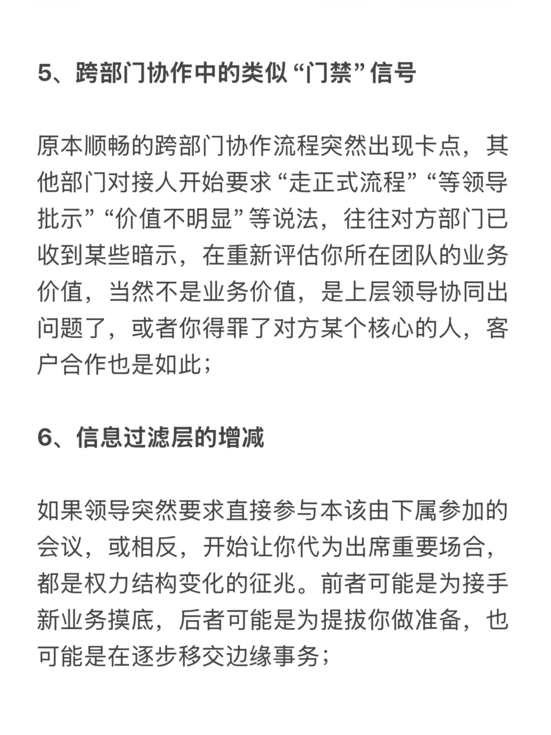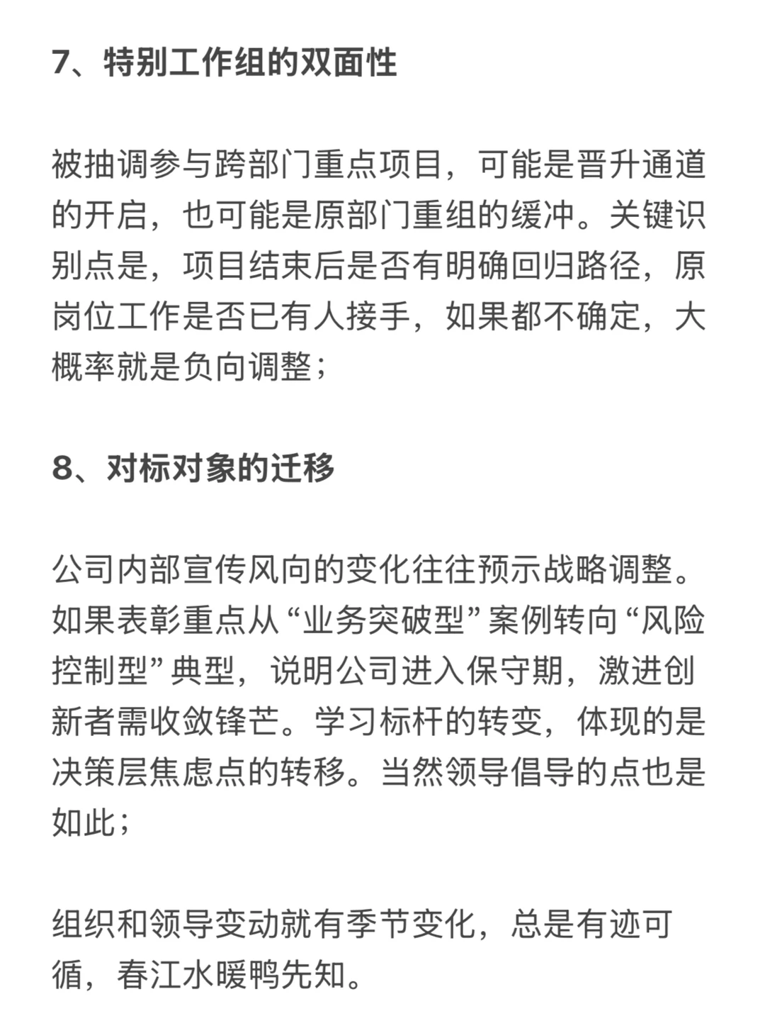 组织和领导变动就像季节变化,总是有迹可循,春江水暖鸭先知。 另外如果你在变动中捞不到好处,就别瞎打听了,免得殃及池鱼 如果能捞到好处或者正向调整,那么知道的信息别瞎传,事以密成 如果对你是坏结果,那就把水搞浑,浑水摸鱼