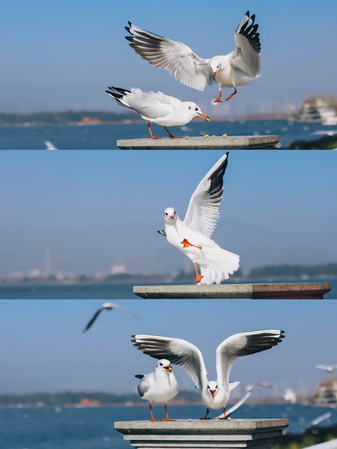 🔺在拍和海鸥合影的照片时记得全程用高速连拍,确认好构图后就开始疯狂抓拍,海鸥飞行速度很快,我们需要尽可能多地拍,去抓到多只海鸥都在画面里且飞行姿势好看的照片