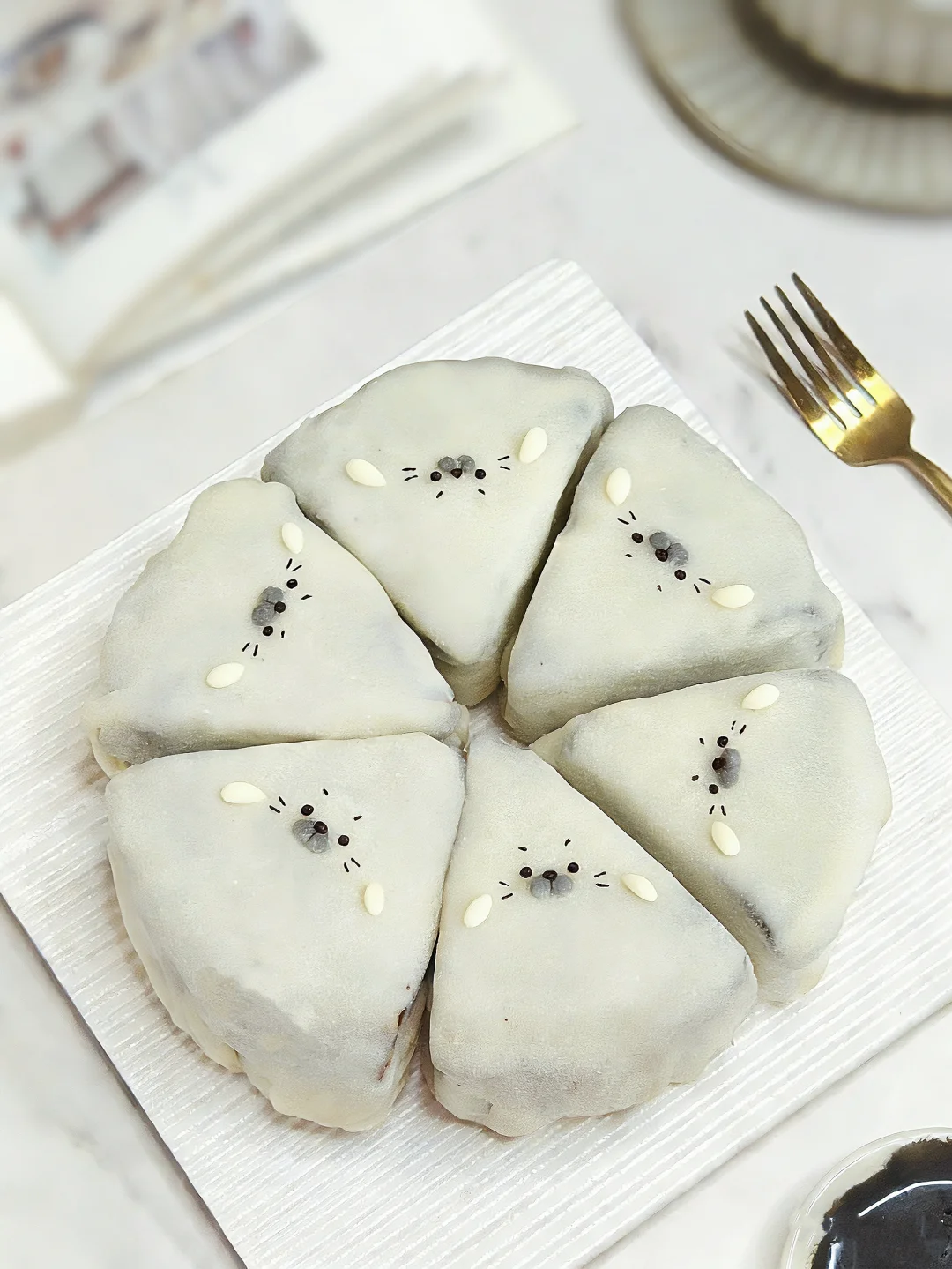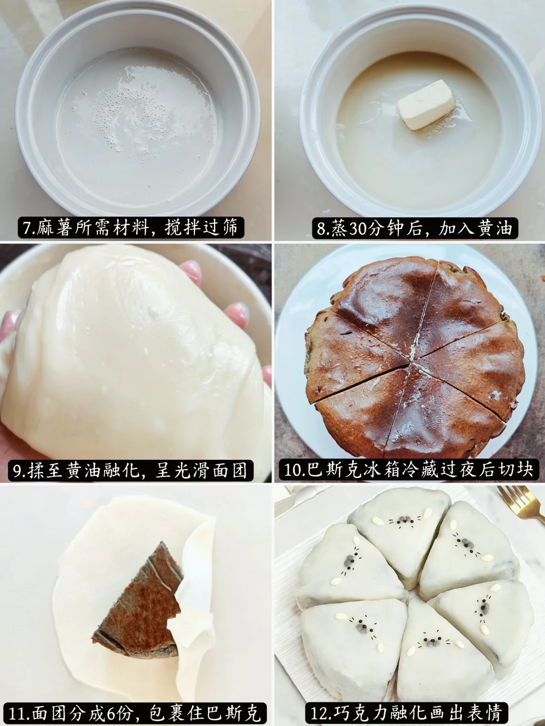 6⃣️冷藏好的巴斯克切成6块,把麻薯也均分成6份,擀成圆片后包入巴斯克