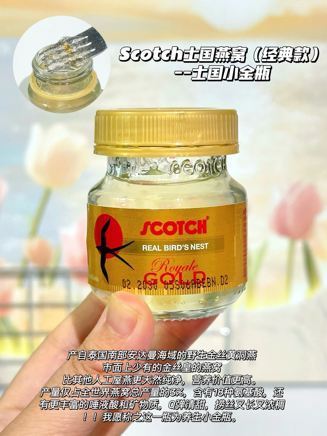 产自泰国南部安达曼海域的野生金丝黄洞燕,在泰国销量一骑绝尘!比其他人工屋燕更天然纯净,营养价值更高,产量仅占全世界燕窝总产量的3%,里面18种氨基酸,还有更丰富的唾液酸和矿物质,日常我直接喝或者加点喜欢的水果蓝莓啥的一起喝,就是妥妥的滋补小甜水,Q弹清甜,捞丝又长又浓稠!!