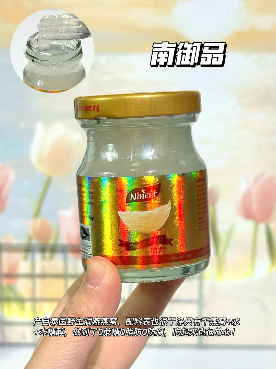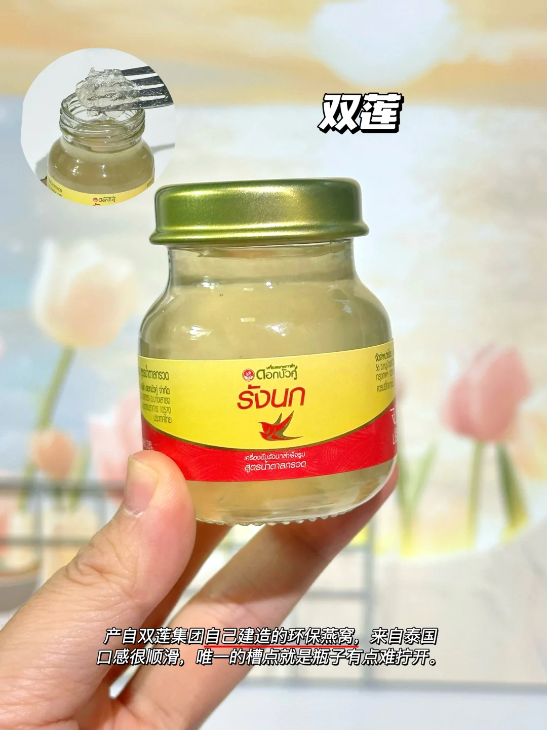 产自双莲集团自己建造的环保燕窝,来自泰国,口感很顺滑,唯一的槽点就是瓶子有点难拧开