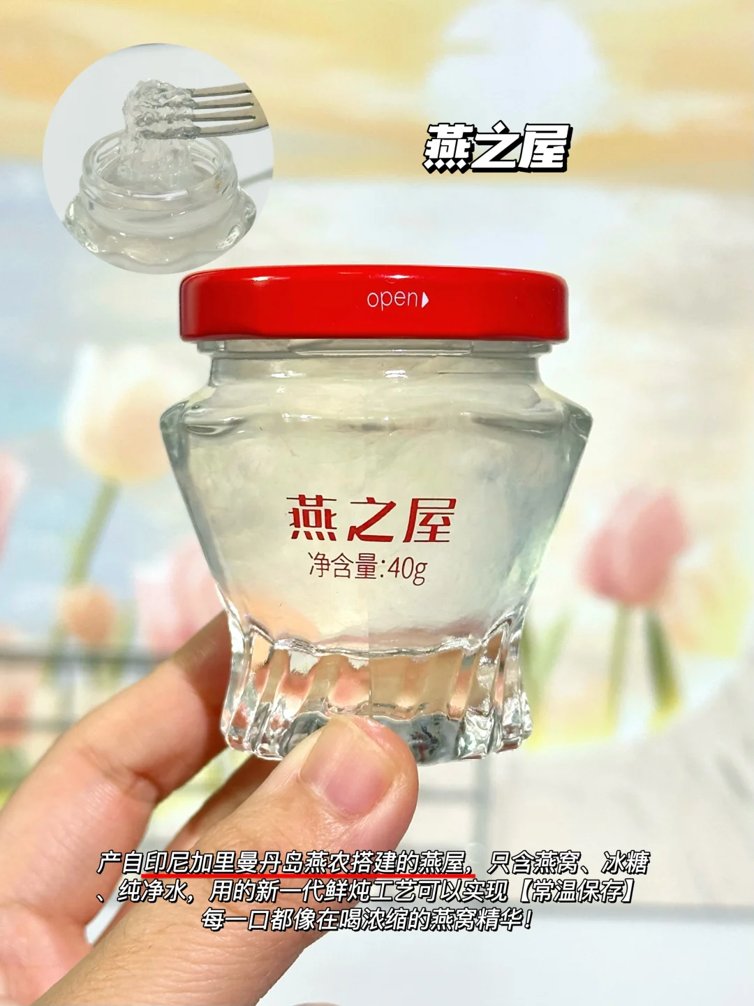 产自印尼加里曼丹岛燕农搭建的燕屋,只含燕窝、冰糖、纯净水,用的新一代鲜炖工艺可以实现【常温保存】 每一口都像在喝浓缩的燕窝精华!