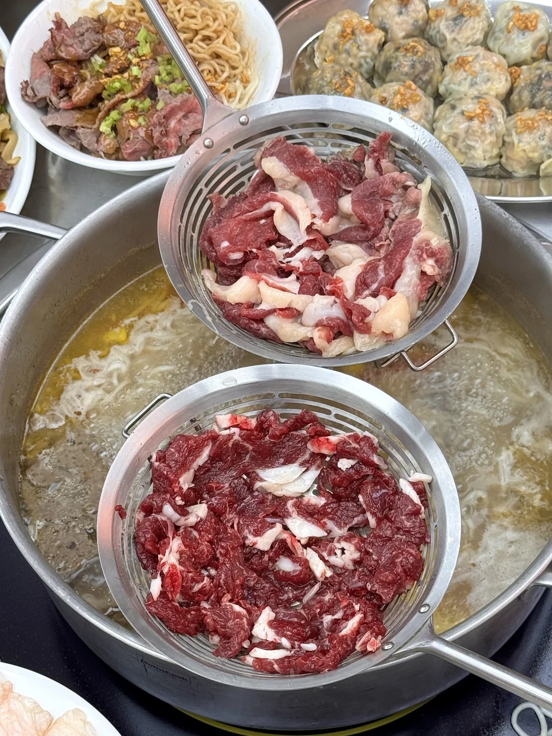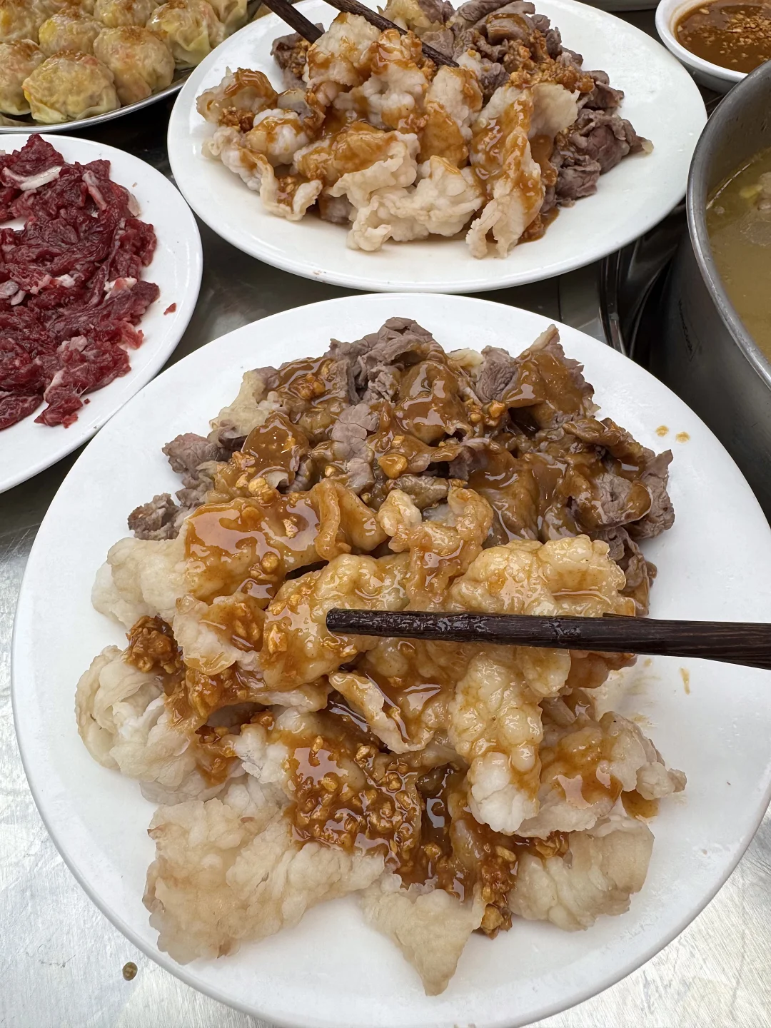 潮汕薄皮炊饺!!胖嘟嘟的好饱满一个🤤阿姨每天现包的,饺子皮薄馅大晶莹剔透,一口下去好过瘾啊啊!怎么会这么好吃!! 叫:鼎馥)基本都是附近居民来吃!主打的潮汕牛肉火锅涮几秒就能吃,蘸点沙茶酱简直绝杀!湿炒牛肉粿条、沙茶牛肉蟹皇面…全程和朋友边吃边夸。。
