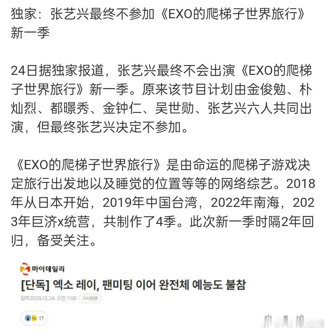 张艺兴不参加EXO新团综录制了张艺兴不出演EXO新团综了 wow张艺兴最终不参加exo新团综录制了