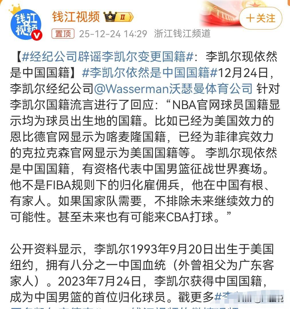 网传篮球运动员李凯尔改为了美国籍。 但事实真的是这样的吗? 12月24日,经纪公司辟谣了。 李凯尔依然是中国国籍。 他在中国有家有亲人。 仍然可以代表中国队出战。 是中国籍就好。