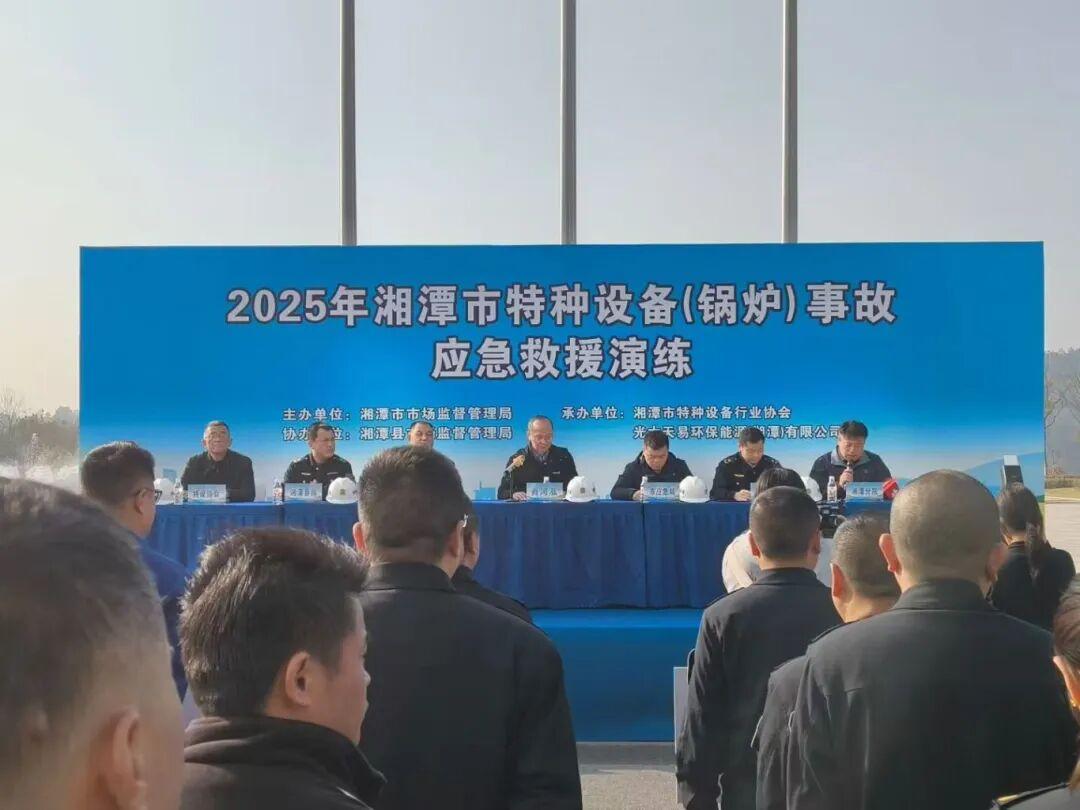 近日,由湘潭市市场监督管理局主办的2025年湘潭市特种设备(锅炉)事故应急救援演练,在位于湘潭县河口镇的光大天易环保能源(湘潭)有限公司举行。市、县两级市场监管局特种设备分管领导、股室负责人及相关工作人员,市应急管理局相关负责人,部分锅炉使用单位的安全总监、安全员代表等100余人观摩了这次演练。