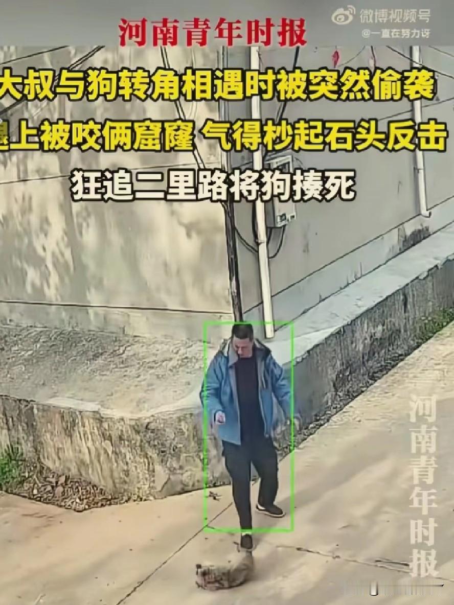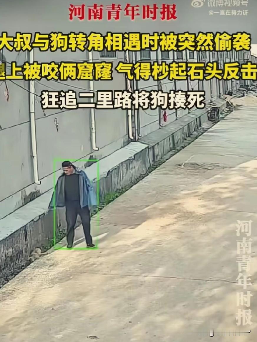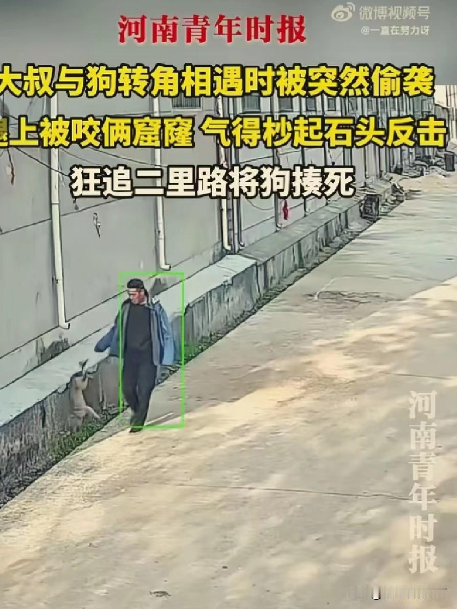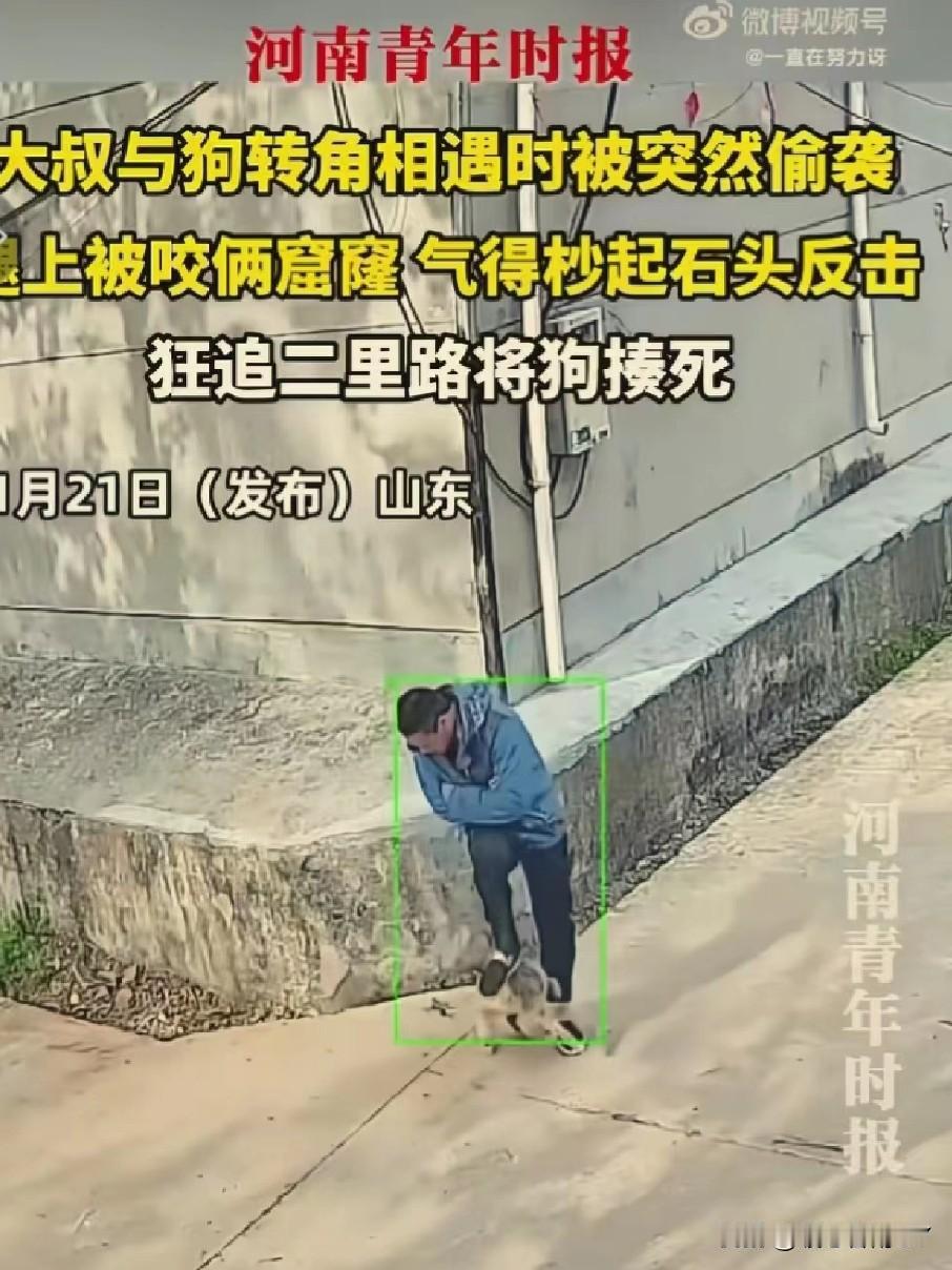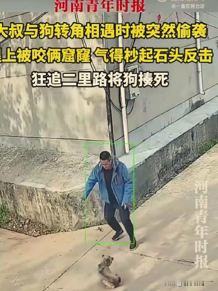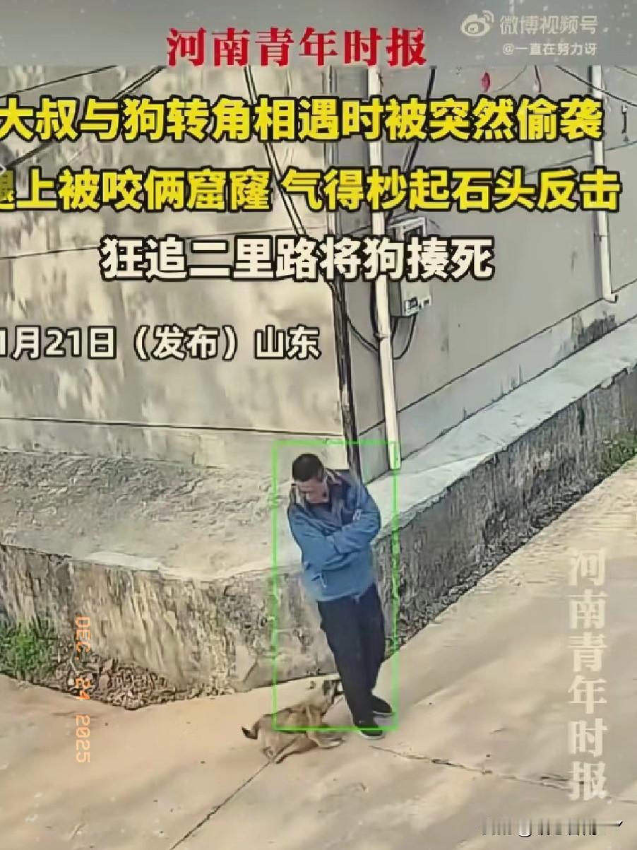 山东大叔追打恶犬:不拴绳之犬,咬伤路人,更碎了养宠人的“体面” 2025年11月21日,山东有一男子在巷口突遭未拴绳的狗偷袭,腿上被咬出两个血窟窿。 他怒不可遏,抄起石头追了二里路,最终将狗打死。 此事看似解气,实则是养犬不规范引发的极端冲突。文明养犬,拴绳是底线。 主人不拴绳,让宠物成了“潜在威胁”;被咬者情绪失控后的反击,也使自己陷入纠纷风险。 目睹这起因未拴绳引发真实事件,我们不妨扪心自问:出门遛狗时,你给自家毛孩子拴绳了吗?这根绳,拴的是对路人的安全,也是养宠人的责任与体面,你真的系好了吗?