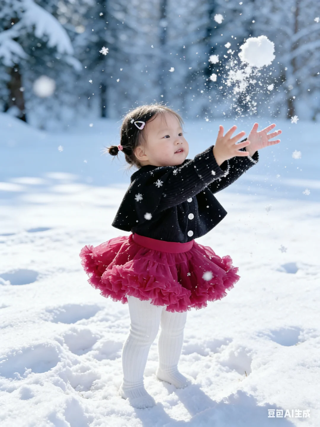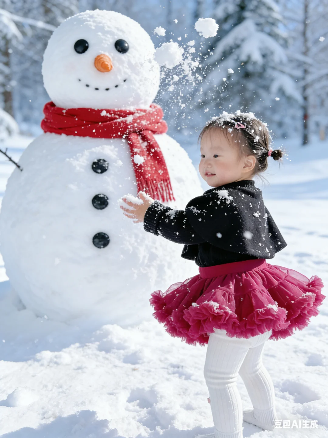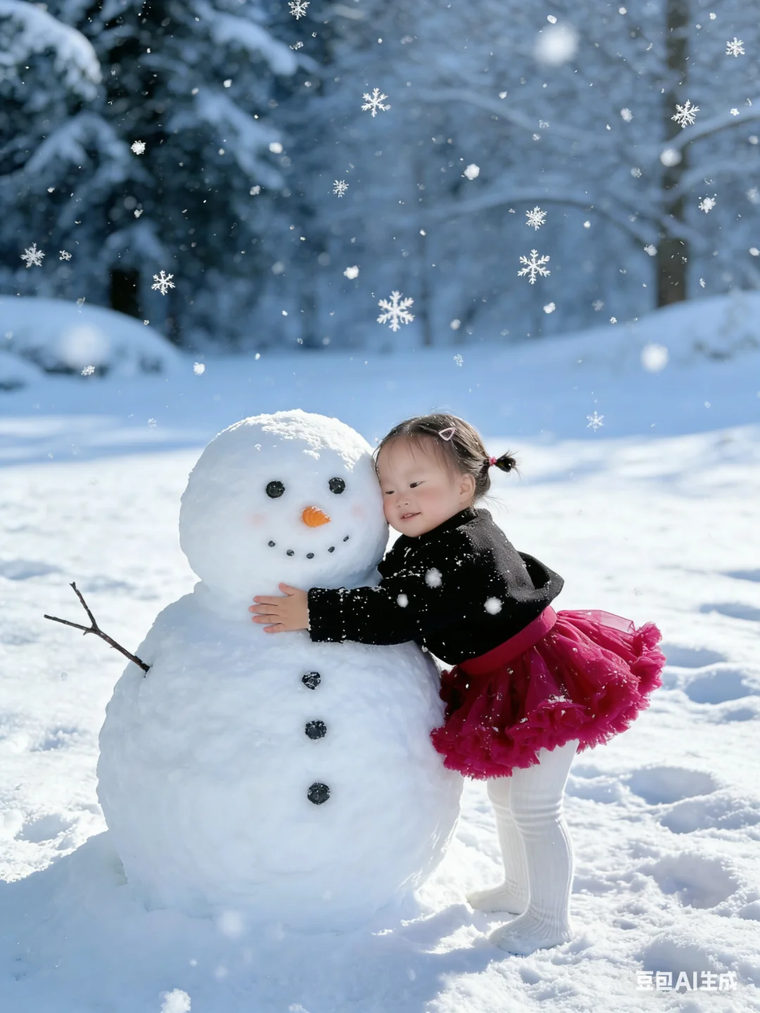 谁说拍雪景照非要去冰天雪地的户外? 我直接用豆包AI给娃生成了雪景写真, 全程宅家0折腾,效果却惊艳到我✨ 只需要上传宝宝的日常照片, 描述想要的玩雪、堆雪人场景, 豆包就会精准还原宝宝五官, 搭配飘雪、雪人、雪地森林的布景, 动作还超多样,有撒雪、堆雪人、抱雪人各种可爱瞬间, 红黑小裙子在白雪里超出片! 再也不用心疼娃冻着,也不用扛着设备跑户外, 宝妈们快安排起来~