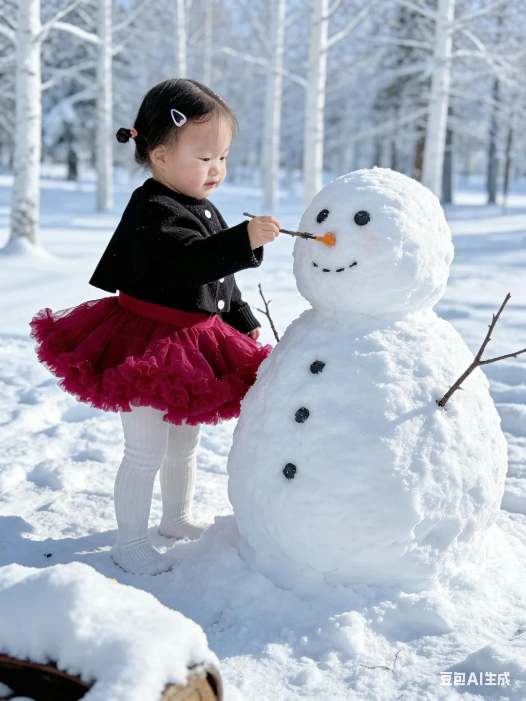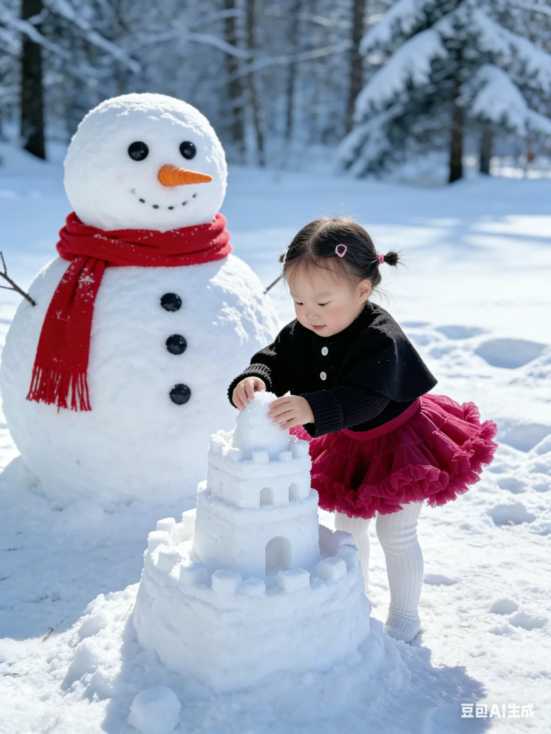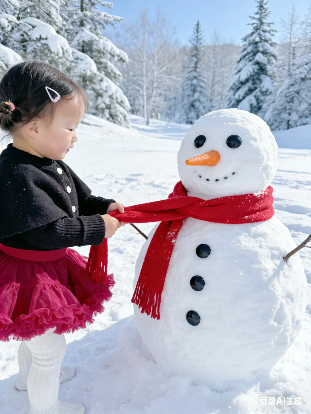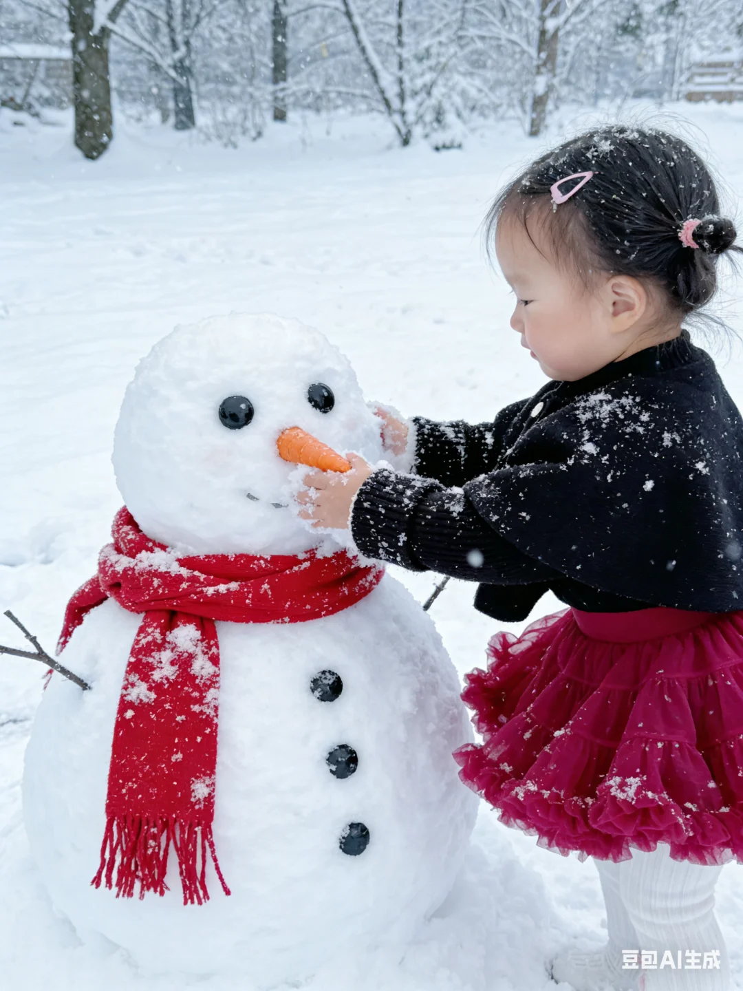 谁说拍雪景照非要去冰天雪地的户外? 我直接用豆包AI给娃生成了雪景写真, 全程宅家0折腾,效果却惊艳到我✨ 只需要上传宝宝的日常照片, 描述想要的玩雪、堆雪人场景, 豆包就会精准还原宝宝五官, 搭配飘雪、雪人、雪地森林的布景, 动作还超多样,有撒雪、堆雪人、抱雪人各种可爱瞬间, 红黑小裙子在白雪里超出片! 再也不用心疼娃冻着,也不用扛着设备跑户外, 宝妈们快安排起来~