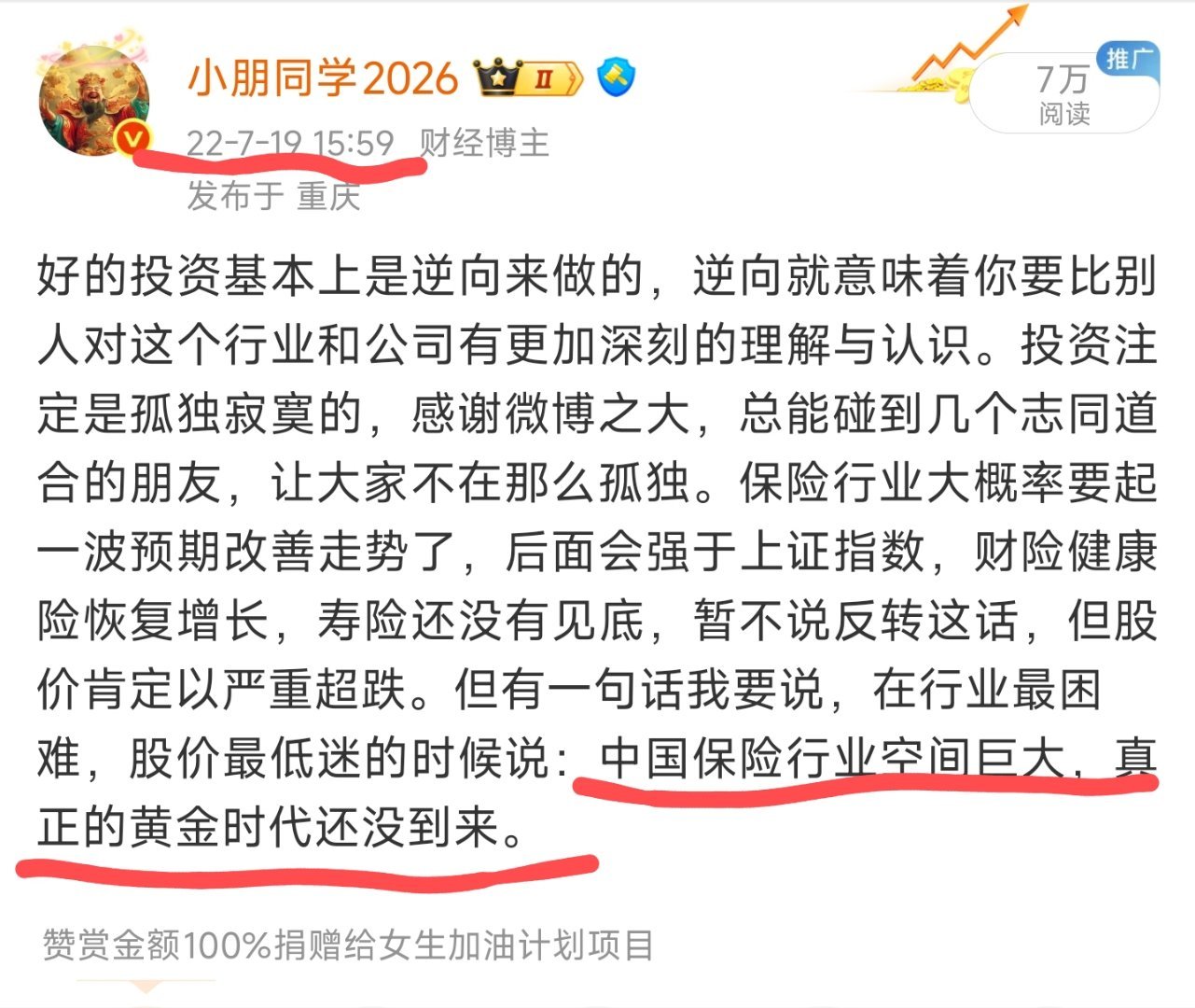 券商开始说保险黄金时代来了。然而就在几年前股价下跌到40元的时候,我说中国保险行业黄金时代还没到来的时候,评论区一片嘘骂声。事实证明: 有独立思考的人,永远是极少数。