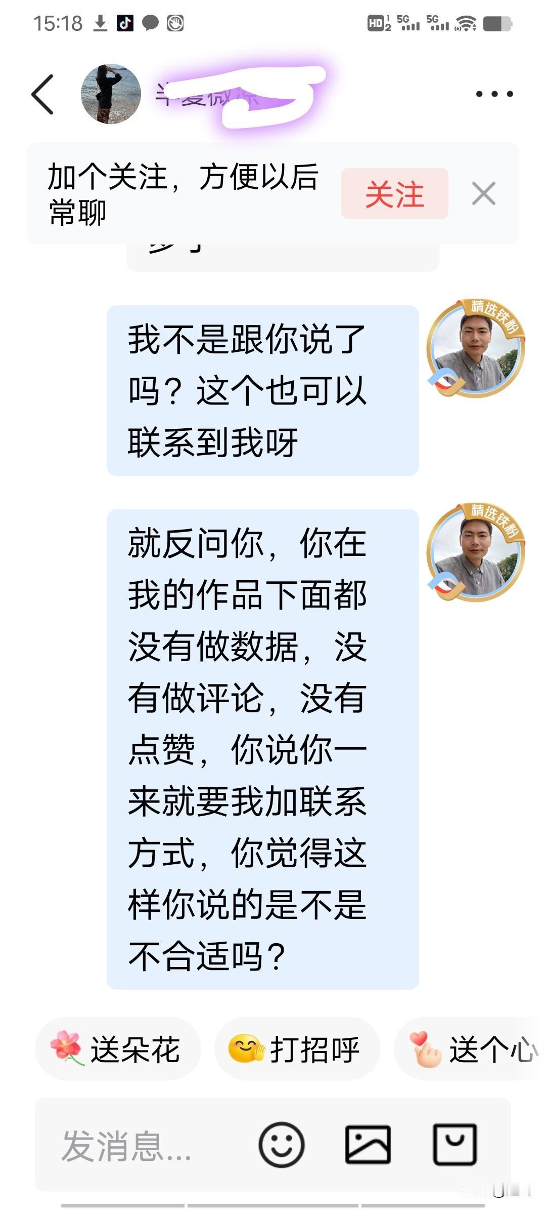 刚刚被我拉黑了一个用户。 关注我两三天了,我的作品下面既不点赞,又不评论,一直给我私信加联系方式,直接拉黑并向平台举报了。 我可是一个老主播了,你这种小伎俩,以我不知道你要干什么?很容易被平台关起来的。 加联系方式,可以呀,你至少要成为我的老铁, 在我的作品下面文字评论,点赞,收藏,转发做了数据才可以嘛。 友友,你们是把她叫骗子,还是叫小白嘞?