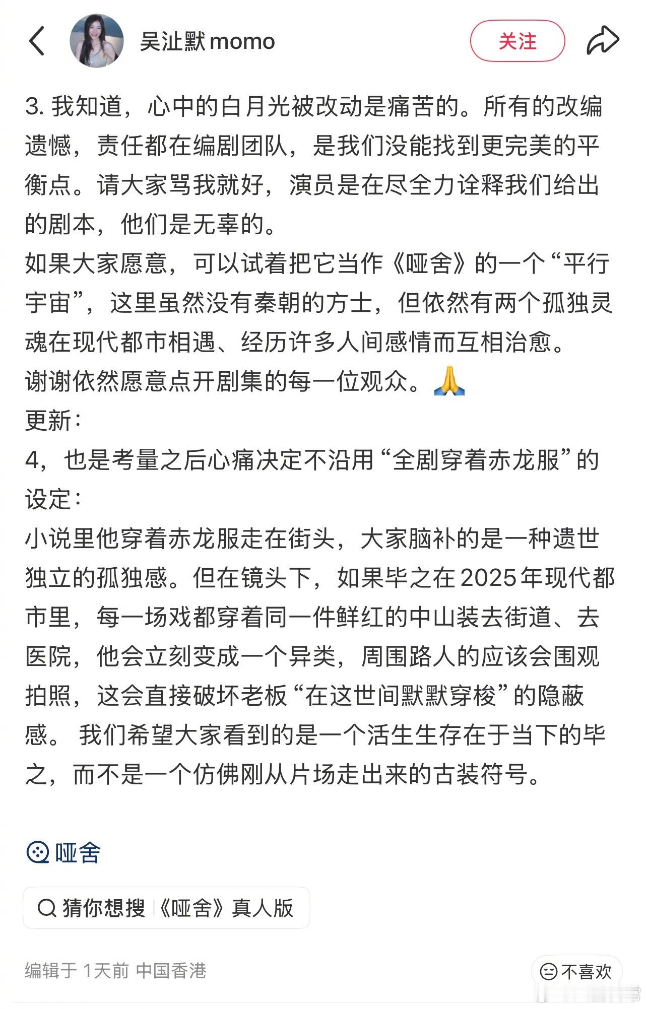 电视剧《哑舍》编剧吴沚默道歉,发长文回应改编争议哑舍为啥播成这样