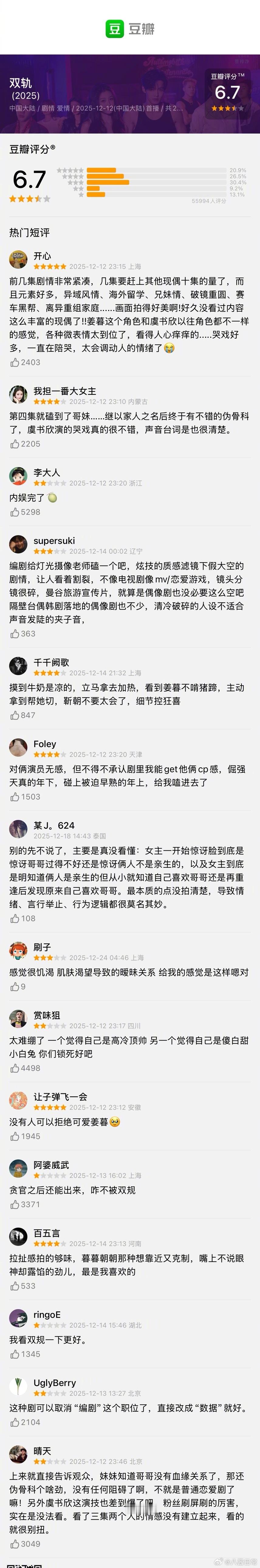 虞书欣、何与《双轨》豆瓣开分6.7分虞书欣双轨开分