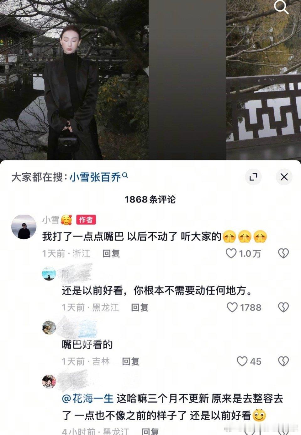 张百乔老婆整容网友说眼睛,鼻子,嘴巴好像都和以前不一样了,没有以前好看。小雪回应称嘟了下嘴,以后不动了。感觉是妆容问题吧,可能真的化妆能改变一个人的样貌吧,再就是更瘦了,人瘦了五官就会更立体,所以认不出了。