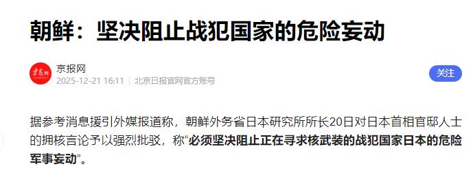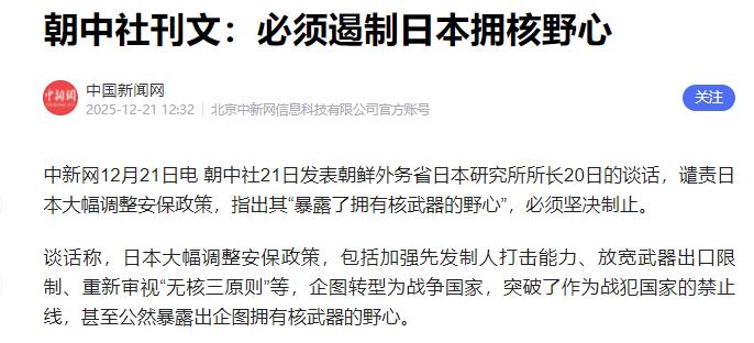 晴天霹雳!朝鲜突然送给日本一个全新称谓,直接戳破了高市早苗的幻想! 就在12月21日,朝中社公开刊发声明,朝鲜外务省日本研究所所长将日本定性为“战犯国家”。 最近日本政坛真是越来越不收敛了,防卫开支直接冲到了GDP的2%,创下了战后新高,光2025财年的防卫预算就快11万亿日元。 不只是花钱多,动作还特别实,又是买护卫舰、部署战斧导弹,又是列装F-35B隐形战机,甚至还成立了联合作战司令部,一门心思往军事扩张的路上狂奔。 更让人揪心的是,他们居然堂而皇之地讨论起“拥核”,内阁里有人直接喊着“日本应当拥有核武器”,防卫大臣被问起时躲躲闪闪,连“无核三原则”都不肯明确承诺死守。 别以为这只是嘴上说说,国际原子能机构的报告早就亮了底,日本已经囤了47.8吨分离钚,其中10吨是武器级的。 按每枚核弹需要6到8公斤钚来算,这些材料足够造6000枚以上核弹头。 再加上他们有超级计算机能模拟核爆炸,不用做实体试验就能搞出核装置,真要动手,6到12个月就能组装出来,这可不是闹着玩的。 不光军事上搞扩张,在外交上日本还频频越界,尤其是日本首相高市早苗,居然把手伸到了咱们中国的台湾问题上。 公然说“台湾有事”就是日本的“存亡危机事态”,明里暗里暗示要武力介入。 就在高市早苗还想着靠“无前提和朝鲜最高领导人见面”这种外交秀博眼球、挽支持率的时候,朝鲜直接给了她一记响亮的耳光。 12月21日,朝中社公开发表声明,朝鲜外务省日本研究所所长直接把日本定性为“战犯国家”。 有意思的是,就在前一天,俄罗斯副外长鲁登科刚明确表态,反对日本围绕“拥核”展开的任何讨论,称日本的“再军事化”只会加剧东北亚紧张局势。 结果第二天朝鲜就直接亮出了“战犯国家”的标签,可见日本的危险动向已经让周边国家忍无可忍了。 朝鲜为啥敢这么直接给日本定性?其实这顶帽子一点都不冤,回头翻翻历史就知道,两国之间的血海深仇摆在那。 早从1910年开始,日本就把朝鲜半岛变成了殖民地,一统治就是35年,逼着朝鲜人改日本名字、不准说朝鲜话,搞奴化教育想彻底抹掉人家的民族根脉。 还强征了大批劳工做苦役,无数朝鲜妇女被抓去当“慰安妇”,到死都没等来一句真心的道歉和应有的赔偿。 对于朝鲜来说,日本的侵略伤痛刻在民族骨子里,现在看到日本又在疯狂扩军,自然不会坐视不管。不光是朝鲜,整个亚洲都记着日本当年的暴行。 朝鲜这次直接喊出“战犯国家”,算是把高市早苗的伪装撕得干干净净。 她本来以为靠喊几句会面的口号,就能转移国内视线,还能在美日韩同盟里显显自己的“外交能力”,结果朝鲜根本不买账,直接点破了日本军国主义复活的真面目。 现在国际社会也都看清了日本的野心,中国多次警告日本别重走军国主义老路,还向联合国秘书长致函阐明严正立场; 俄罗斯明确反对日本讨论拥核;马来西亚、新加坡等国媒体也都在密切关注日本的军备扩张,担心东北亚局势变得不稳定。 其实朝鲜这声怒吼,也是替所有被日本侵略过的亚洲国家说出了心里话。 历史不能忘记,罪责不能逃脱,一个不承认历史、不清算罪行,还在疯狂扩军、妄图染指核武器的国家,迟早会再次给地区带来灾难。