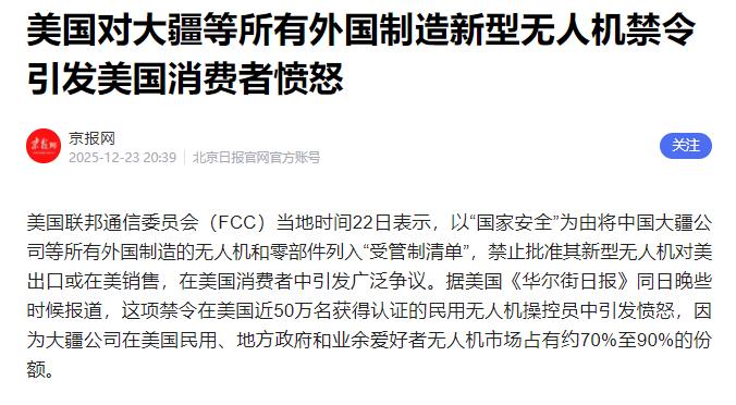 美国看中国没有对日本动手,又开始打压中国了,美国本来希望中日打一仗,趁机卖给日本武器,同时拖垮中国经济,让中国停止发展,好维持自己的霸权,结果中国没有上美国的当。 这些年美国的霸权焦虑是越来越藏不住了,说白了核心就一个原因:中国踏踏实实地搞发展,综合国力一天比一天强,让这个全球霸主坐不住了。 以前美国还总想着躲在背后搞小动作,现在挑事不成,干脆亲自下场,从各个方面下手打压中国,把霸权主义的底色暴露得明明白白。 最近,美国联邦通信委员会搞了个小动作,以“国家安全”为借口,把所有外国制造的新型无人机和零部件都放进了“受管制清单”,明眼人都知道,这就是冲着中国无人机企业来的。 要知道,大疆在全球工业级无人机市场的份额超过50%,美国的农业喷洒、建筑施工、消防救援这些行业都离不了它,全美差不多50万名注册无人机飞手都靠大疆的设备吃饭。 这禁令一出来,中国企业还没怎么样,美国自己人先慌了,不少飞手赶紧囤设备,就怕丢了饭碗,连代表飞手利益的组织都站出来反对。 其实这也不是美国第一次针对大疆了,2022年就胡乱把大疆列进“中国军工企业”清单,大疆维权起诉后,美国法院还做出了不合理判决。 直到2025年10月大疆还在坚持上诉,嘴上喊着“国家安全”,本质上就是霸道地想遏制中国科技发展。 说起来,在亲自下场打压之前,美国还打了个如意算盘,就是挑动中日冲突,自己坐收渔利。 美国之所以选中日本,一方面是因为日本是它在亚太的核心盟友,另一方面中日之间有历史遗留问题和领土分歧,在它眼里是挑事的最佳棋子。 这些年美国没少给日本“松绑”,鼓励日本扩充军备、推进修宪进程、增加防卫预算,还把钓鱼岛纳入日美安保条约范围,明里暗里给日本撑腰。 同时在国际上大肆炒作“中国威胁论”,想方设法挑动日本民众对中国的不满。 美国的小算盘打得精:只要中日开打,日本肯定得大批量买美国的武器,从战机导弹到军舰雷达,每一样都是天价,美国军火商就能赚得盆满钵满。 更阴险的是,它想复制拖垮苏联的老路,让中国把大量精力和资金投入战争,打乱经济发展规划,这样就没法跟美国竞争了。 可美国万万没料到,这步棋彻底打错了。 中国始终保持着理性和定力,清楚地知道战争只会给两国人民和亚太地区带来灾难,所以不管美国怎么挑唆、日本怎么挑衅,都坚持通过对话协商解决分歧。 更关键的是,中国已经连续多年是日本最大的贸易伙伴,2024年两国贸易总额就有3083亿美元,日本17.6%的出口都销往中国,22.2%的进口来自中国。真要是开战,日本经济也得垮掉。 事实已经证明,中国的发展势头不是靠打压就能阻挡的,美国这种违背市场规律、破坏全球产业链的做法,最终只会反噬自身。 就像美光科技因为对华限制,中国区营收占比从2023年的14.03%骤降到7.1%,被迫退出中国数据中心市场;应用材料也因为新管制措施损失了7.1亿美元收入,股价单日下跌5.2%。 说到底,霸权主义那套已经行不通了,合作共赢才是大势所趋。