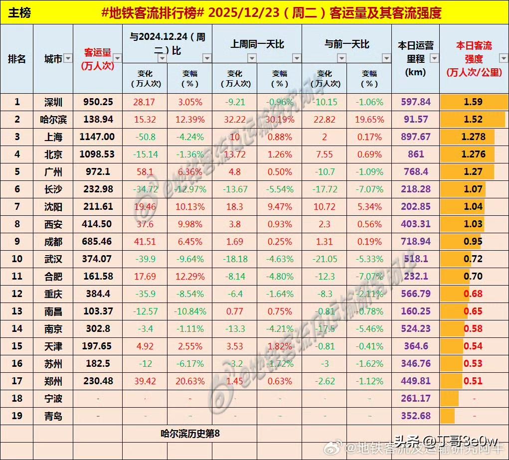 哈尔滨地铁客流量周二达138万人次以上,创历史第八位[呲牙][呲牙][呲牙] 爆料 身边事 地铁客流排行榜 中国地铁客流日报 昨日客流 排行榜 周二 哈尔滨地铁 2025年12月23日 星期② 全国重点城市轨道交通客流量排行榜: 上海:1147.00万 北京:1098.53万 广州:972.10万广州地铁 深圳:950.25万深圳地铁 成都:688.89万成都地铁 西安:414.50万西安爆料 重庆:384.40万重庆身边事 武汉:374.07万 南京:302.80万南京地铁 长沙:232.98万长沙身边事 郑州:230.48万郑州爆料 沈阳:211.61万 天津:197.65万天津地铁 苏州:182.50万苏州地铁 合肥:161.58万 哈尔滨138.94万哈尔滨爆料 青岛:100万+青岛身边事 宁波:100万+ 南昌:103.37万