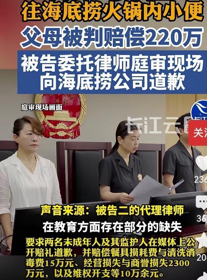 一泡尿220万!这大概是史上最贵的一泡尿!家长们该醒醒了! 两个17岁少年的一时“刺激”,让全家付出了惨痛代价——往火锅里撒尿的恶作剧,最终以法院判决220万元赔偿收场(详见附图)。 监控镜头记录下的荒唐一幕:包间门一关,两个半大小子相视一笑,竟对着沸腾的火锅便溺。他们或许觉得“好玩”,或许以为“没人知道”,却不知道这泡尿会浇出怎样的惊天巨浪。 法院的判决书来了——公开道歉+220万赔偿金,全部由监护人承担。这记重拳打的不仅是孩子的荒唐,更是家长的失职! 评论区炸了:“17岁还不懂基本廉耻?”“家长平时怎么教的?”“这代价够买套房了!”字字戳心。 现实中,多少家长还在用“孩子还小”“只是淘气”当挡箭牌?饭桌上抢人筷子是“活泼”,公共场合大吵大闹是“天性”,破坏公物是“好奇”……一次次的纵容,终于在某一天酿成了无法挽回的苦果。 教育的缺失从来不是突然发生的。那两个少年在做出惊人举动前,一定早就露出过端倪——或许是缺乏敬畏的眼神,或许是对规则的漠视,或许是家长那句“出了事爸妈兜着”的承诺。 这220万买的不是火锅底料,而是一堂刻骨铭心的家教课:孩子的行为边界需要家长亲手绘制,社会的规则底线从来不开玩笑。你今天不舍得管教的,明天社会会加倍管教;你今天纵容的“小恶”,明天可能变成摧毁家庭的“大祸”。 真正爱孩子,就该在他第一次试探底线时严肃制止,在他第一次冒犯他人时责令道歉。家教不是挂在墙上的家训,而是刻在 家庭里的点点滴滴。 别等到天价账单送来时才后悔——教育的代价,永远比赔偿金更沉重。尿事件 火锅内小便 海底捞尿火锅