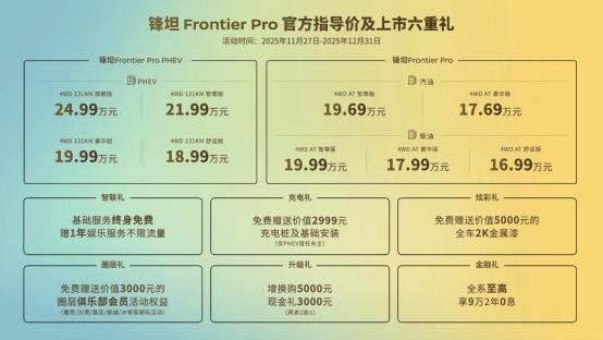 周末想拖房车去露营,工作日要穿梭市区,偶尔还得帮家里拉点装修材料——原本以为得备两台车,直到郑州日产锋坦Frontier Pro全球首发,才解决了我的“全能车焦虑”。 这台车最戳我的是全能不妥协,日产皮卡锋坦Frontier Pro5520mm越级车身带来同级最大驾乘空间,后排坐三人不拥挤,货箱能装下1338L物品,7种座椅组合能拓展出970L纯平空间,近3吨牵引力拖6米房车也轻松。   锋坦Frontier Pro的安全性也是非常强,L2级智能辅助驾驶搭配540°高清全景影像,包含透明底盘、拖车影像和障碍提醒,盲区全覆盖。它的车身70%是高强钢,车架更是高达97%,PHEV版电池有四重防护,越野涉水都安心。   锋坦Frontier Pro的舒适感也没落下,前排“日产大沙发”带通风加热按摩,14.6寸大屏加氛围灯很有质感;后排靠背三档可调,90°开启的后车门上下车超方便。智能四驱搭配13种驾驶模式,还有“三把锁”,复杂路况也能从容应对,燃油版提供最大500N·m扭矩实力能打。PHEV版三种外放电方式,户外用电全自由。   现在锋坦Frontier Pro售价16.99万元-19.99万元,还同步推出尊享6重礼,助力轻松购、放心开。想找一台覆盖城市、户外、越野全场景的车,锋坦Frontier Pro真的值得考虑,毕竟能把潮玩生活装在车轮上的全能皮卡可不多见。