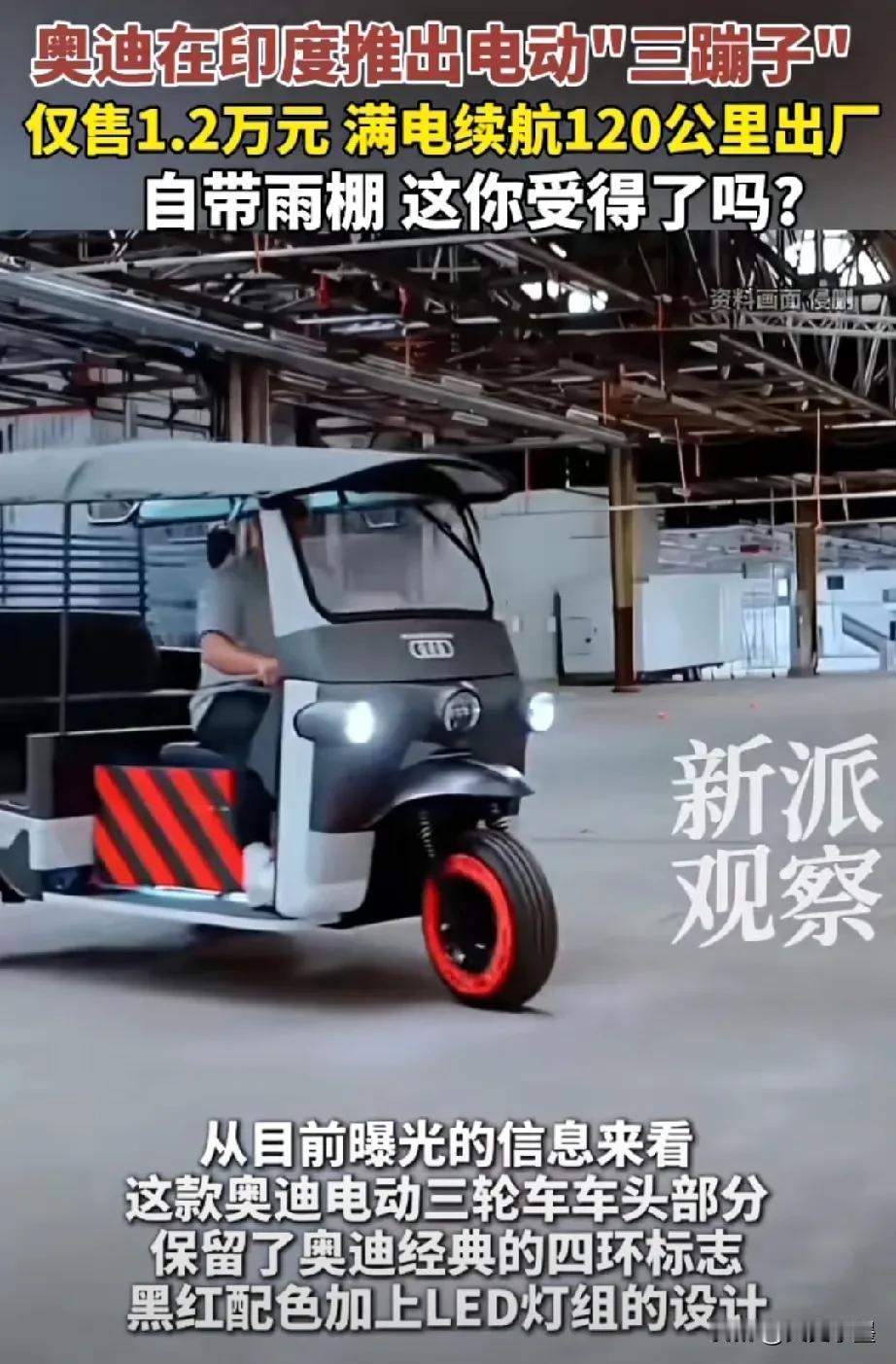 “奥迪”牌电动三轮车在印度出现了,这是一款由奥迪公司与一家印度公司联合设计的电动三轮车🛺,在我国俗称“三蹦子”,现在已遍布大街小巷,因其体型小巧,驾驶方便,经济实惠,备受大众喜爱,尤其是老年人接送孩子,非标方便! 奥迪牌“电动三轮车”在车头继续保留了奥迪经典的四个圈标志,该车头部为黑色,并装有两个LED大灯,内部设计了液晶大屏,整体显得非常大气奢华,车顶有顶棚可以防御雨水,车内有一键启动,使用非常方便! 让人惊喜的是该车仅售价1.2万元,续航却有120公里,在电动三轮车领域算是非常耐跑的了! 有人说这款车如果在国内上市的话,将会非常受欢迎👏,真的吗?