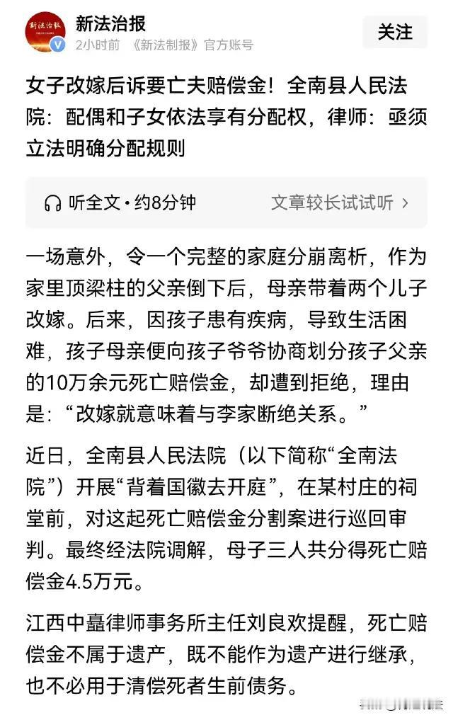 江西赣州,一场突如其来的意外让一个普通家庭陷入了巨大的变故。丈夫意外离世后,妻子获得了10万元的赔偿款,本应成为她和两个儿子生活的保障。然而,仅仅一年后,女子带着两个孩子改嫁,四年时光转瞬而逝,命运再次开了个玩笑——儿子突然重病缠身。面对高额医疗费用,她和前公公商量,试图动用那笔赔偿款为孩子治疗,没想到迎来的一句话却如当头棒喝:“你既然改嫁了,就和我们老李家没关系了!要钱一分没有!” 这段话刺痛了无数人的心。一个母亲为了孩子的生命奔波救治,本该得到曾经家人的支持,然而现实却是冰冷的拒绝。这个拒绝不仅仅是钱的问题,更是人情与道义的撕裂,是家庭纽带在利益和形式面前的脆弱与无奈。前公公的态度让人感慨:亲情真的会因为改嫁而断绝么?还是社会的观念还停留在“前妻即为外人”的旧式框架中? 这起事件背后映射出社会对再婚家庭的偏见与误解,更揭示了当下法律与伦理之间的灰色地带——赔偿款的所有权归属到底该如何定义?当孩子的健康面临威胁,情感与法律的界限成为阻碍救助的围墙。一个本应团结共度难关的大家庭,却因身份变化而冷漠相待,令人愤慨之余,也引发深思:我们应如何构建更加包容且富有人情味的家庭关系? 更重要的是,社会应给这些失去丈夫的母亲和孩子更多的支持和保障,而不是让他们在痛苦中孤军奋战。无论身份如何转换,血缘和亲情都不该被抛弃,孩子的健康更是不容忽视的公共议题。 也许这件事能让我们反思:在面对家庭利益和亲情纠葛时,我们是否能抛开偏见,多一分理解,多一分温情。你怎么看这个“前公婆不帮忙”的现实?不抽烟不喝酒就是好男人吗? 养老院里的老年生活怎么样?