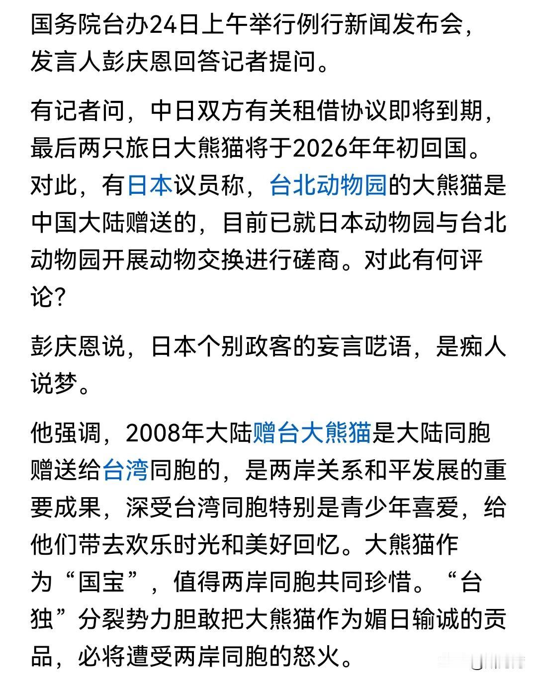 这种事绝不允许发生! 国台办:“台独”势力胆敢把大熊猫当作媚日输诚贡品,必遭两岸