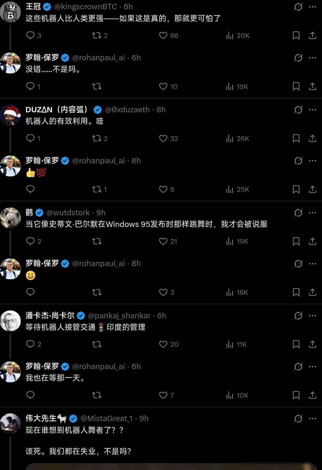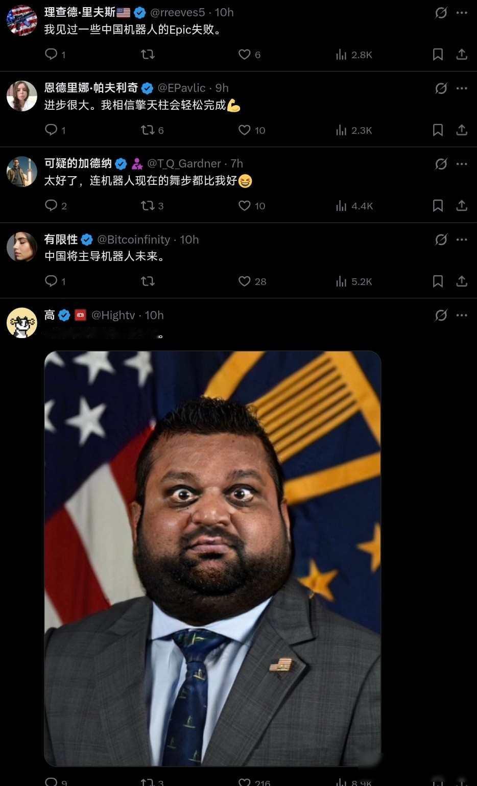 中国歌手演唱会请机器人伴舞,美国网民的天又塌了! 最近在成都的王力宏演唱会上,一群会跳街舞的机器人成了焦点,它们跟着《火力全开》的节奏扭动,还能翻跟头,比年初春晚那批机器人灵活多了。 粉丝拍的视频传到网上,美国网友一看就炸了。 马斯克直接转了视频,底下配了个牛逼的表情,更多人跟着吵起来,有人说这视频肯定是假的,中国机器人不是老翻车吗。 还翻出以前失败的录像当证据,也有人开始担心,中国机器人这么厉害,以后会不会拿去打仗,还有人顺嘴吐槽美国,你们国会天天内斗,中国早把这高科技做出来了。 最巧的是,现场放的歌第一句就是打倒帝国主义,美国人要是听见了,怕是更不痛快,这回他们反应挺热闹,有人生气,有人慌神,反倒让这场演唱会成了跨国的谈资。