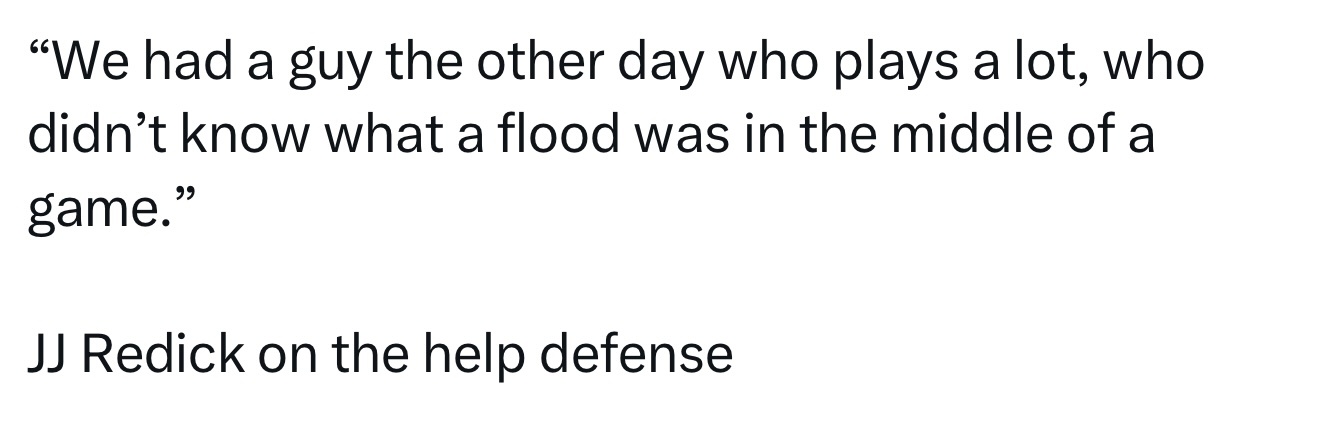 雷迪克谈协防:“前几天我们有个上场时间不少的球员,在比赛打到一半时竟然不知道‘弱侧协防’(Flood)是什么。”