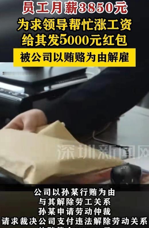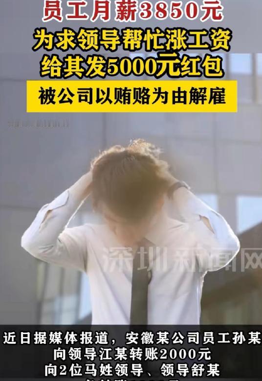 月入3850还被开除, 老板收礼变违法? 五千元打水漂成谜案。 安徽一小伙每月工资三千八,房租水电交完没剩下啥。 他看见同期入职朋友升职加薪,自己却原地踏步,急得团团转。 听说给领导送礼能涨工资,他攒了五千元分四份,转给包括江姓领导在内的四个主管,每人留言求帮忙。 结果工资没涨,反被公司以行贿开除。 小伙提仲裁赢了,拿回赔款两万三,公司不服上诉。 一审时公司用旧版规定判他违法,二审拿出新版文件证明他违规,法院改判公司没错。 最后高院也没支持他,现在没了工作还亏了钱。 这事就这样结束了,五千元打了水,工资也没涨上来。
