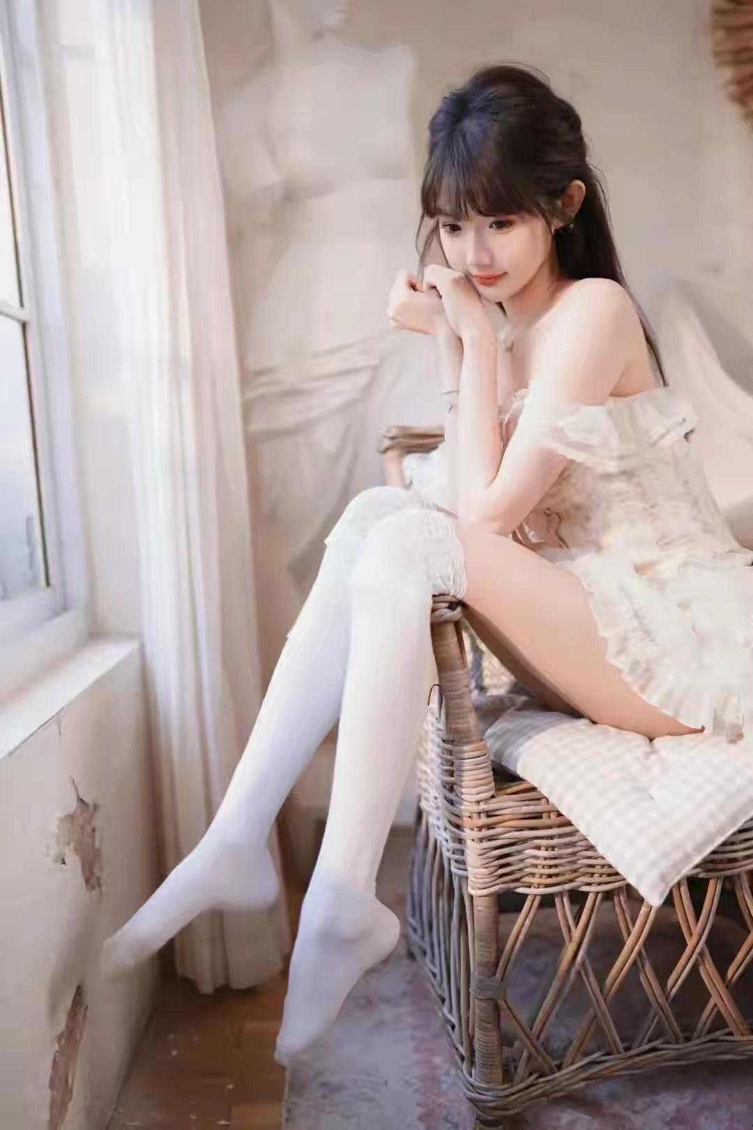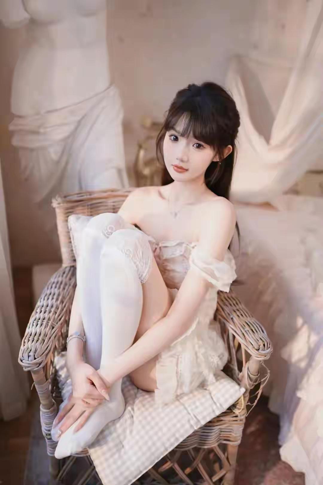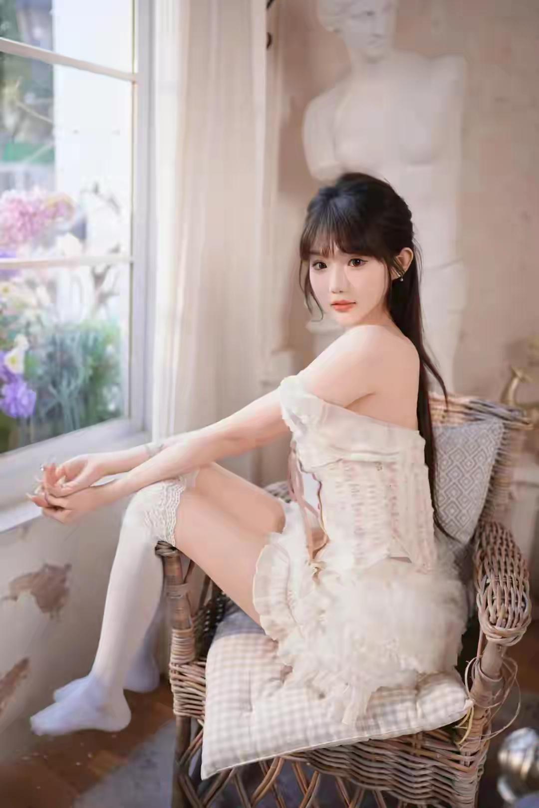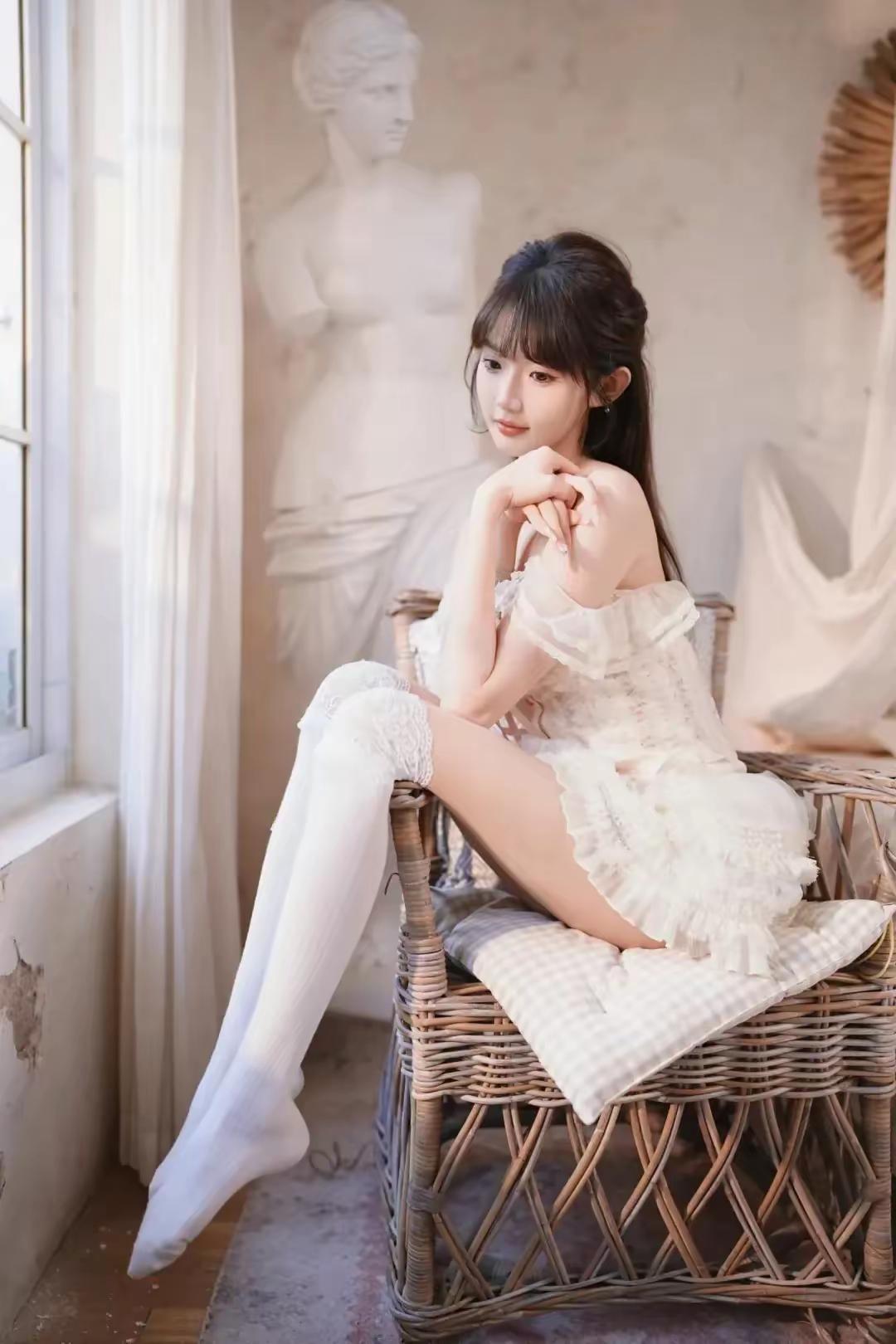 梦幻少女心,坐在藤椅上,穿着蕾丝裙,背景是古典雕像和花束。你认为哪种穿搭最时尚,