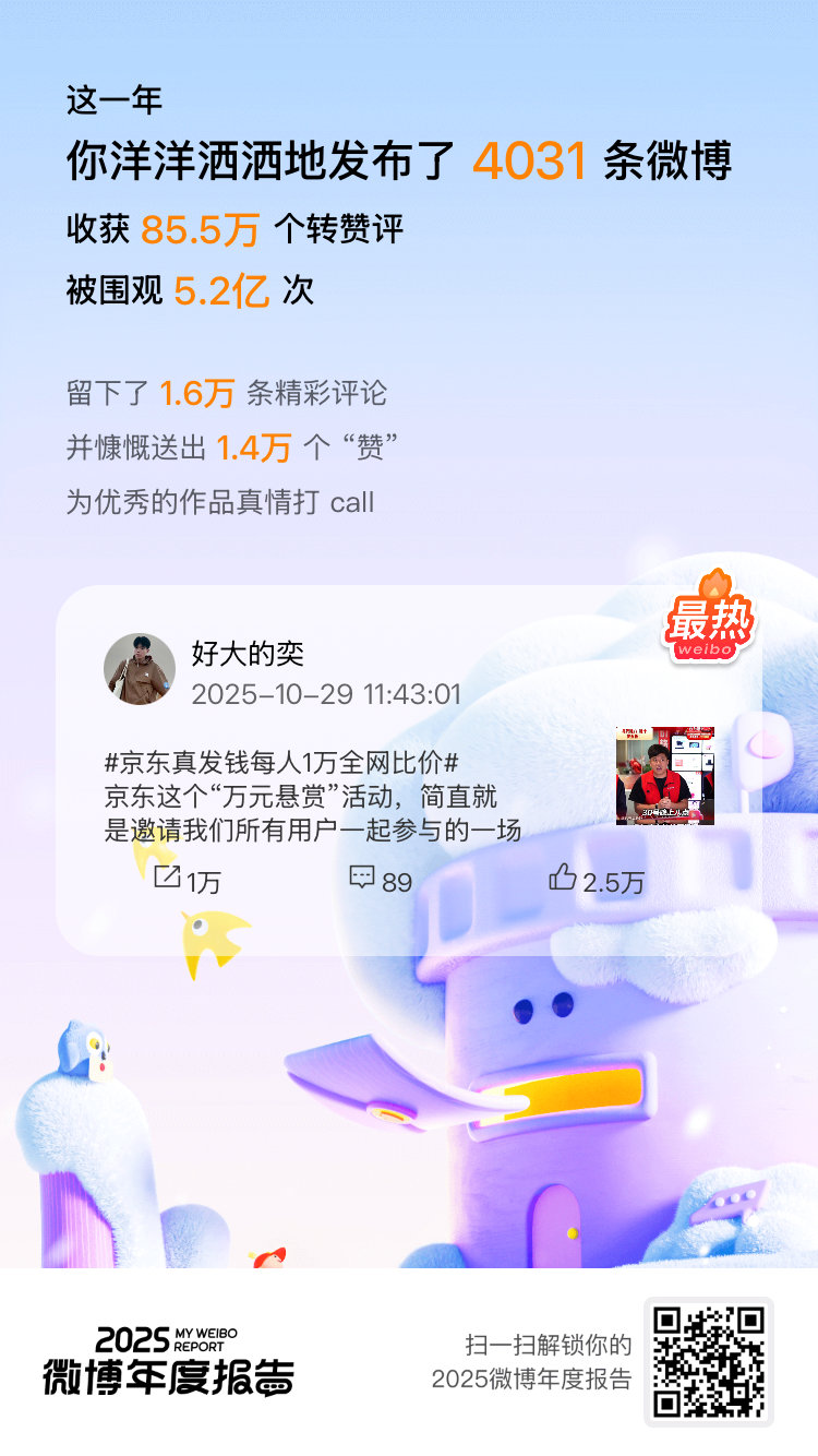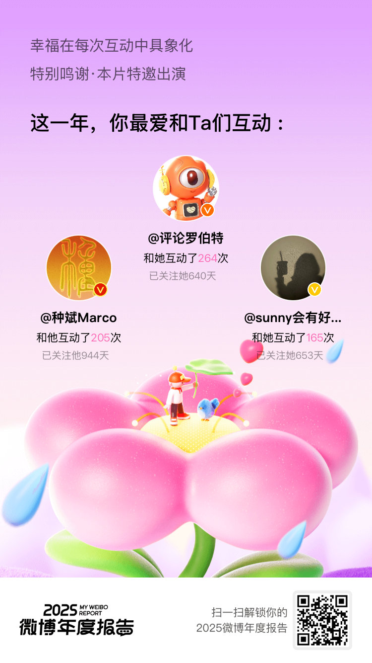微博年度报告 今年码了77万字,和前两年差不多。大家可以看看自己的年度报告:2025微博年度报告