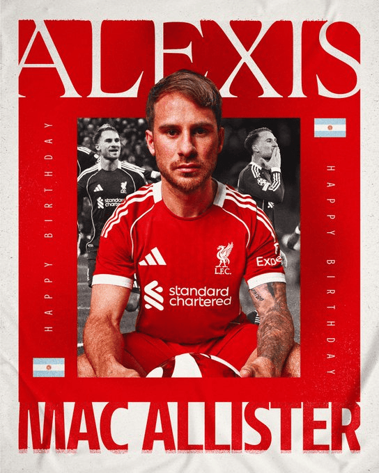 麦卡利斯特迎27岁生日,利物浦官方社媒发布海报送祝福