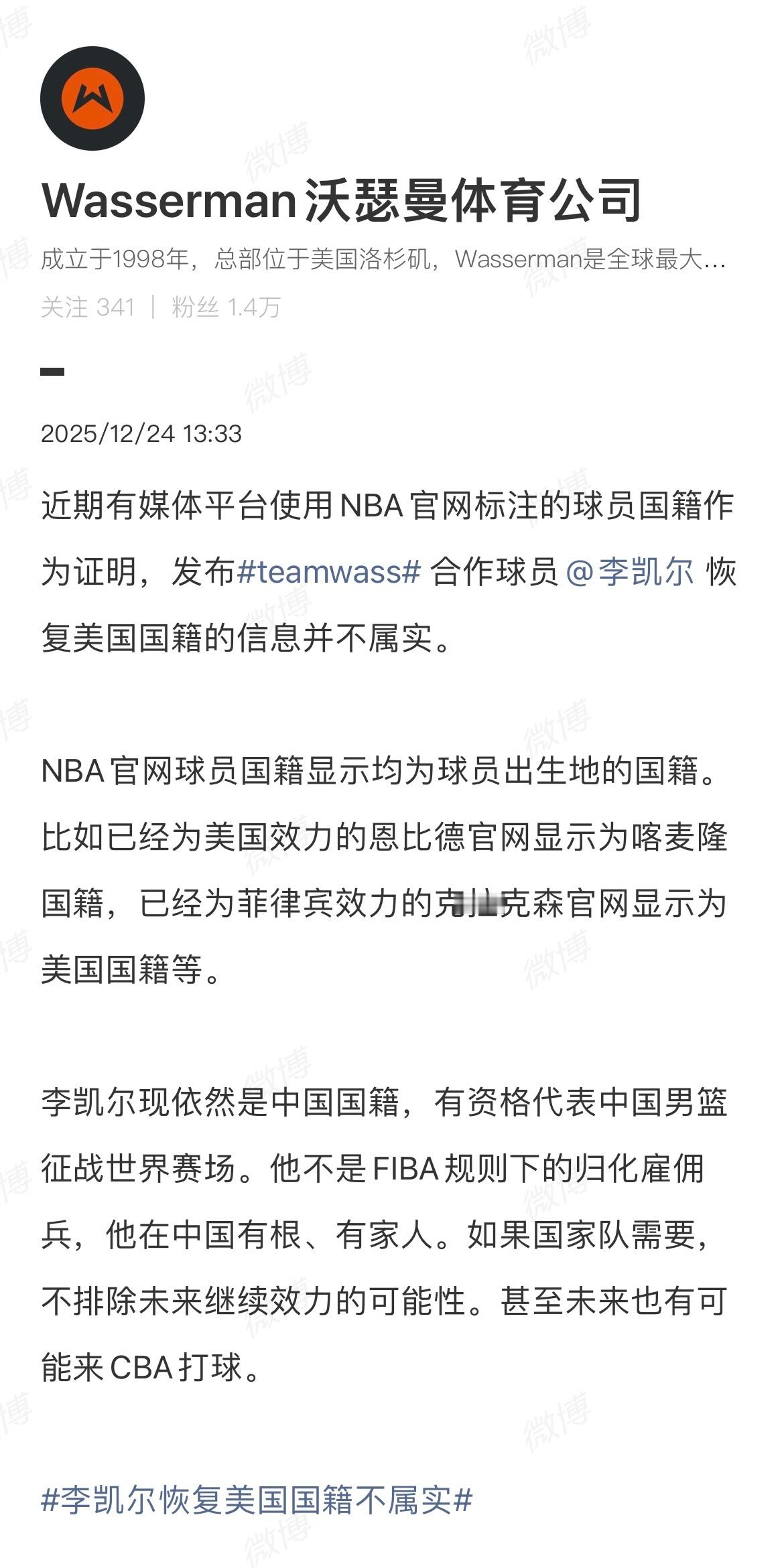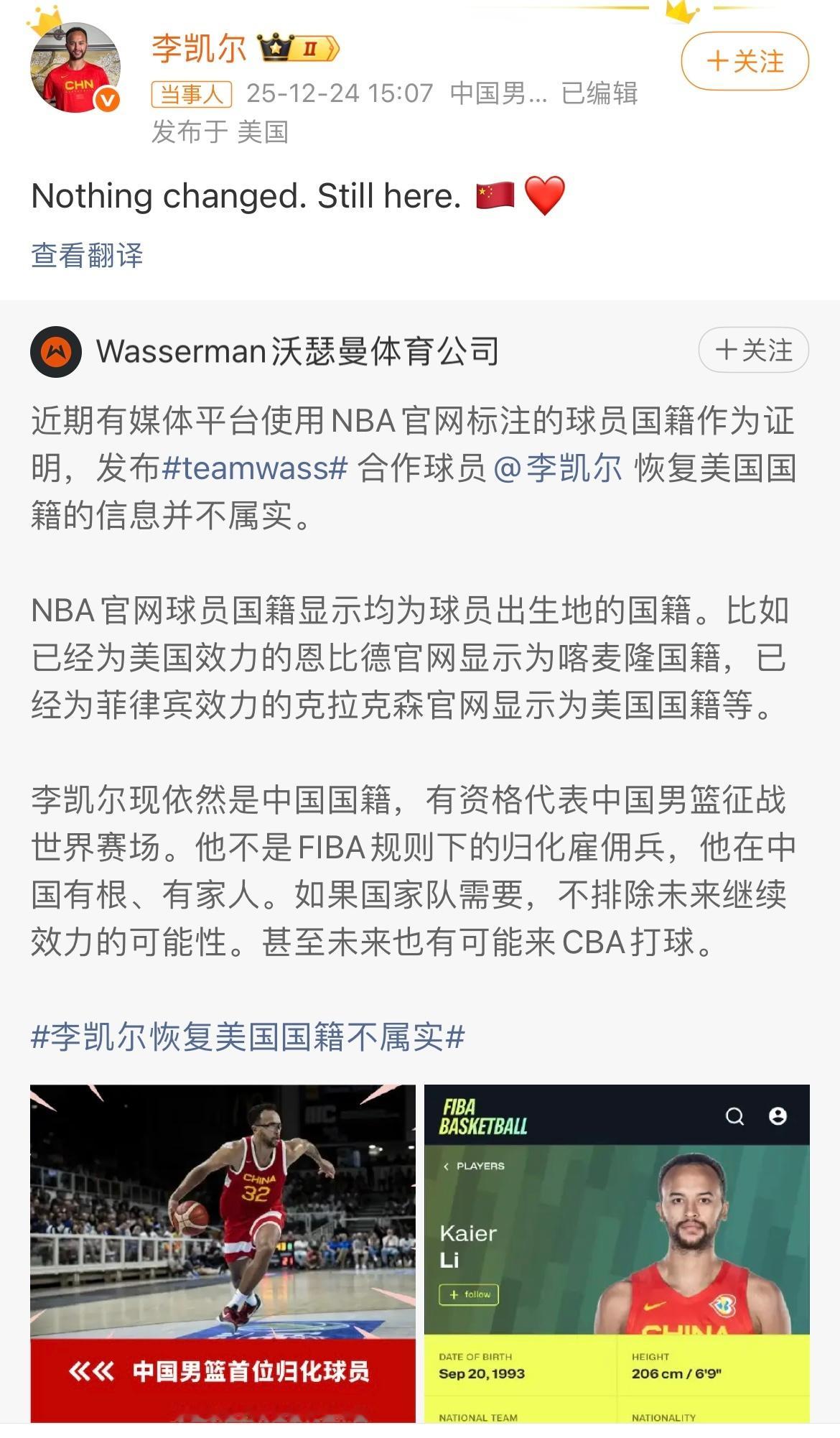 李凯尔转发经纪公司声明并配文:没有改变,仍然在这里!今日,李凯尔经纪公司社媒发文声明:李凯尔现依然是中国国籍,不是归化雇佣兵。李凯尔转发经纪公司声明并配文:没有改变,仍然在这里。在2023男篮世界杯中,李凯尔共出战5场比赛,场均出战32.1分钟,场均得到13分5.6篮板3.4助攻1抢断0.6盖帽,投篮命中率41.8%,三分命中率16.7%,随队获得1胜4负的成绩。李凯尔回应国籍变更李凯尔依然是中国国籍经纪公司称李凯尔仍是中国籍