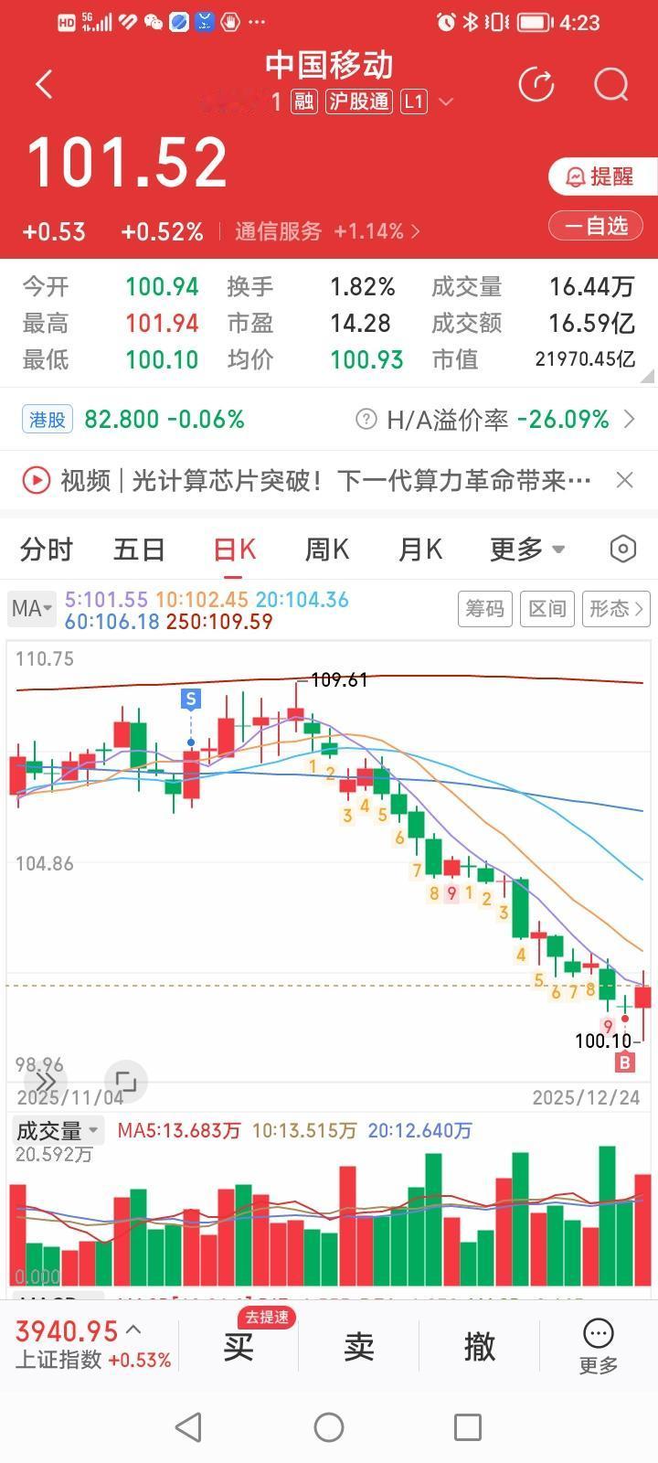 中国移动A,今天走出穿头破脚的探底回升走势,收盘上涨0.52%。单针探底成功了吗? 中国移动今天早盘低开低走,凶狠杀跌,股价最低杀到100.10元,离100元整数关口只差一毛钱,居然留下悬念不杀破。 中国移动就此筑底成功,保持百元整数关口金身不破?还是反弹后再杀一波,再构筑右底时破百元整数关口?似乎都有可能。 至少在三五年看,中国移动业绩优秀的确定性和稳定性在某种意义上比茅台还高,所以从长期主义角度看,中国移动破不破百意义不大,破百大不了也就是多个空头陷阱而已。