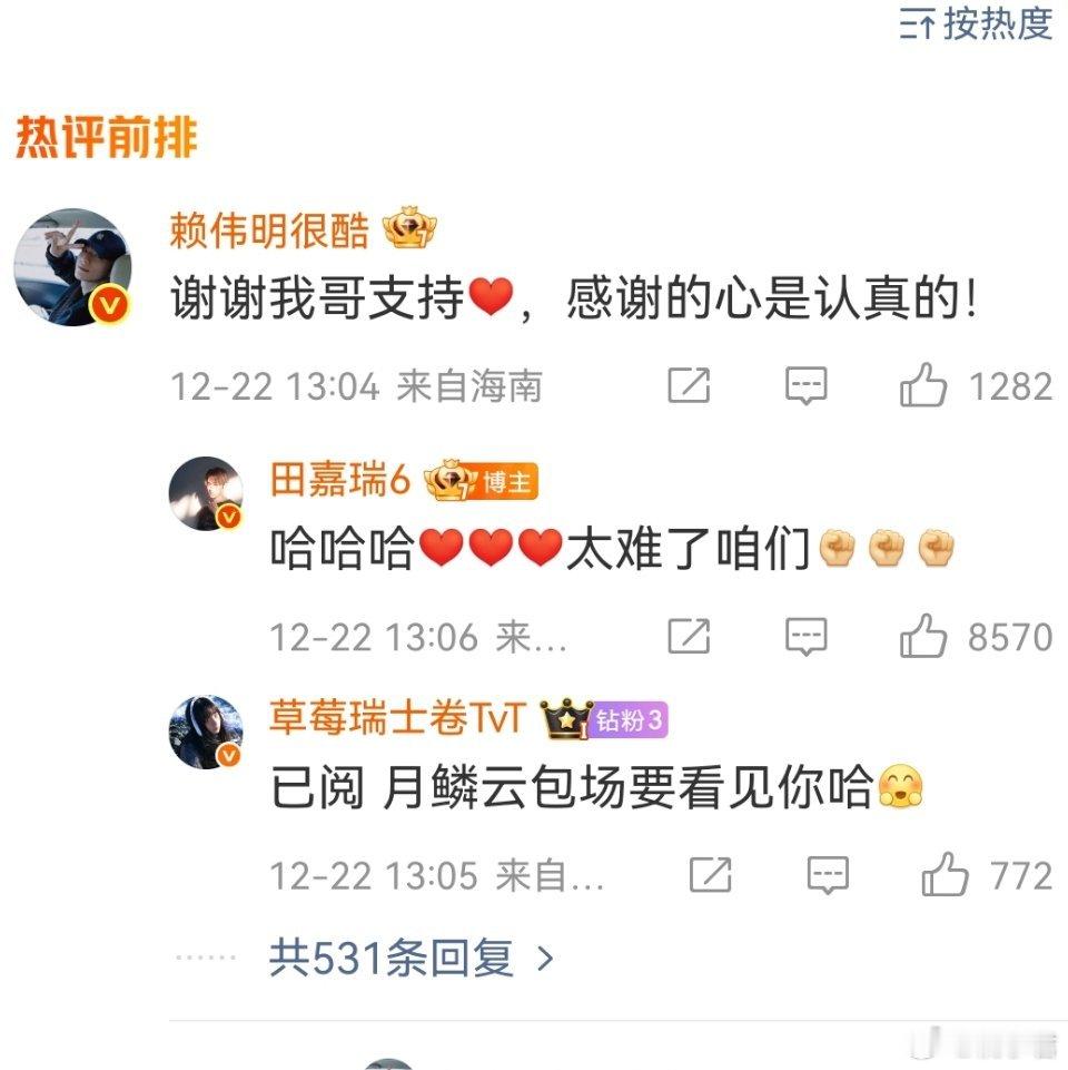 赖伟明 太感谢儿子支持了 笑死,赖伟明那句“感谢儿子支持”一看就是兄弟互怼啊!粉丝们有点小激动可以理解,不过这种男生间的日常玩笑,大家就不用拿着放大镜看啦。赖伟明删除给田嘉瑞的评论