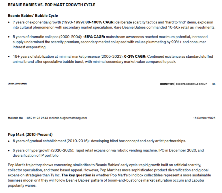 另一家研究机构伯恩斯坦用两份合计近130页的研报重拳出击[3],将泡泡玛特定性为“投机型IP”,和HelloKitty、芭比娃娃这些真正的“常青IP”有本质区别。只要社交媒体的热度过去,就没人买了。