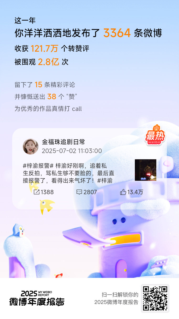 托你们的福,今年我保持金V成就257天 ,借你们的光,橙V保持了108天 !这份快乐也传递给你,速戳>>2025微博年度报告 ,解锁你的微博年度总结吧!微博年度报告微博之夜