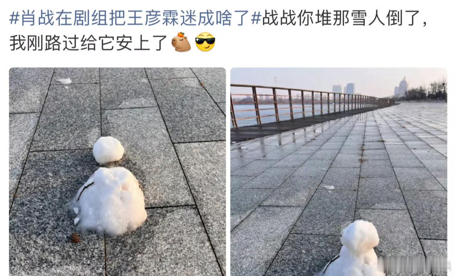 肖战堆的雪人倒了粉丝给肖战的雪人缝缝补补 肖战堆了一个戴墨镜的雪人。结果雪人因为天气转暖化掉倒塌了。没想到随后上演了超暖心的一幕:粉丝自发接力,一起动手把这个雪人重新修补好,从白天一直忙到深夜。这小小的善意行动,打破了圈层,成了年末最治愈的风景。